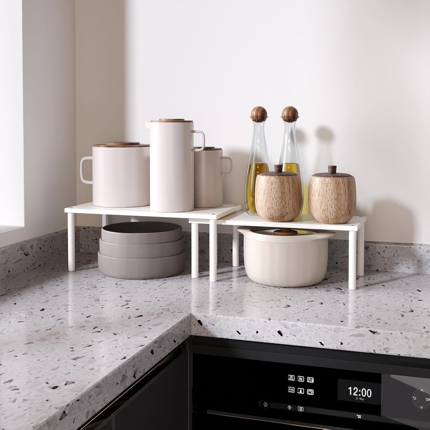 Cabinet Organizer Shelf(Set of 2),Kitchen Counter Shelves,Bamboo Spice Rack Countertop and Cabinet,Stackable Expandable,Large(White)