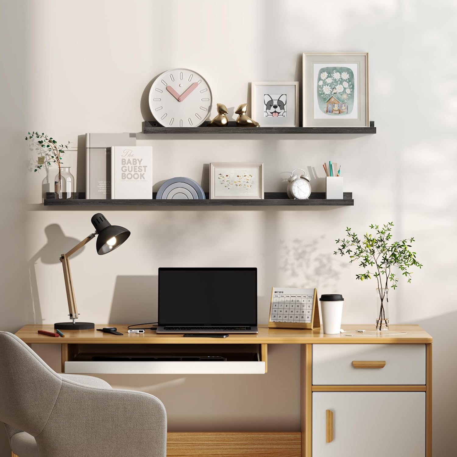 • Quick and Easy Installation: With pre-drilled holes, necessary hardware, and easy-to-follow instructions, our picture ledge shelves are a breeze to install. Each set even comes with a mini level for perfect alignment. Put them up in minutes and start decorating right away!