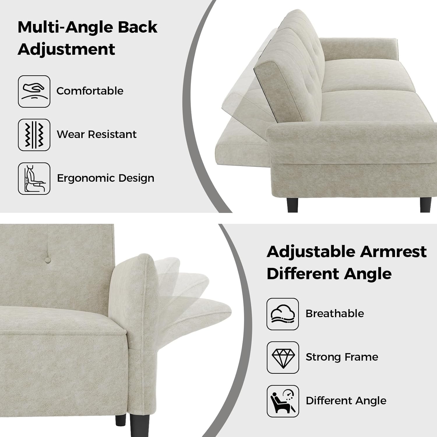 - 【Four-position Adjustable Armrests】Designed in popular styles, this convertible sofa bed is a perfect blend of style and durability. The armrests on both sides can be deployed outward for maximum side lying area, and the maximum deployment angle can be up to 90°. Meanwhile, with the two soft report pillows provided, you can place the pillows at the cervical vertebrae and lumbar region to effectively relieve fatigue