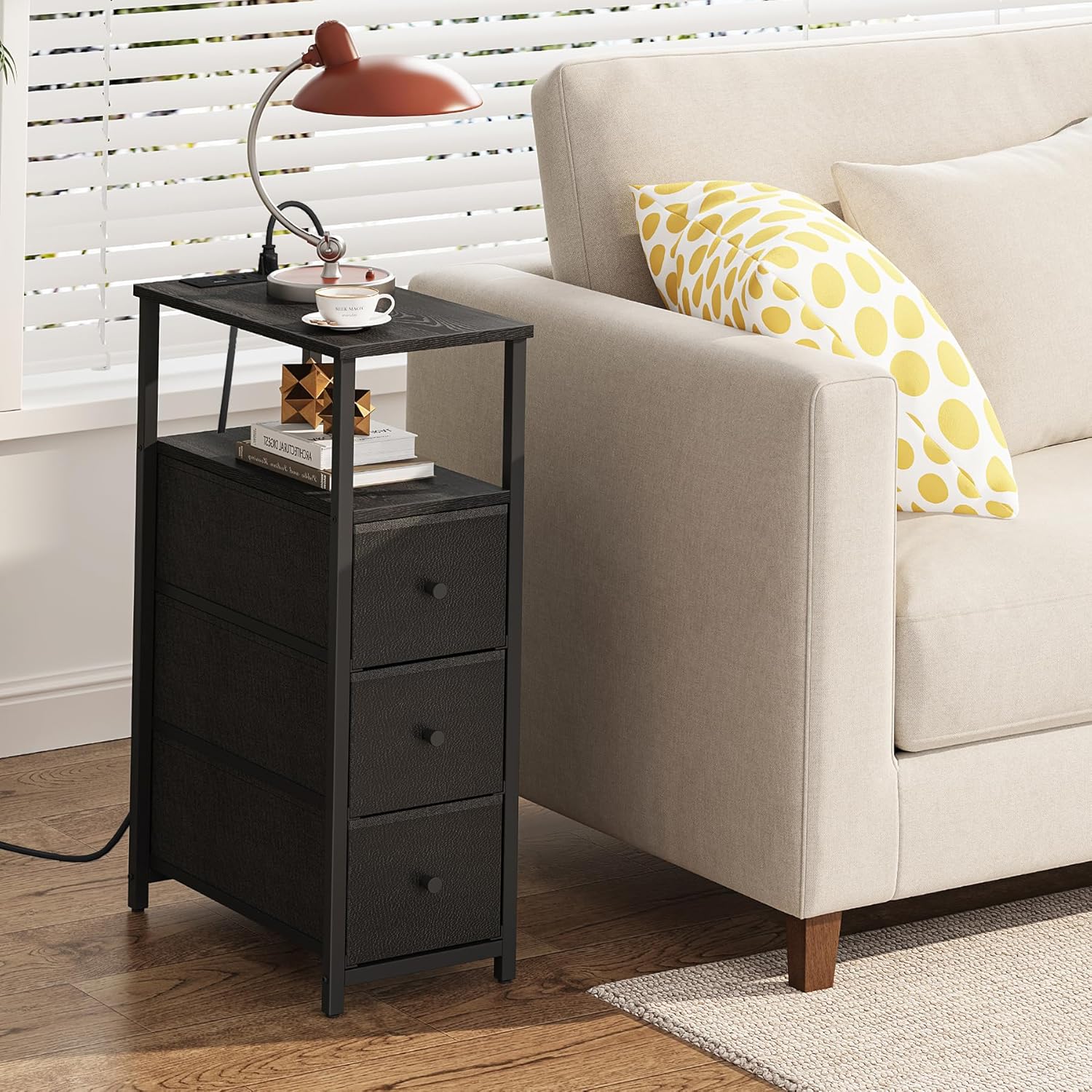 TUTOTAK Narrow Night Stand with Charging Station, Slim End Table with Plugins, Tall Side Table with 3 Fabric Drawer, Small Bedside Table with Storage, Set of 2, Living Room, Bedroom, Black TB01BK073