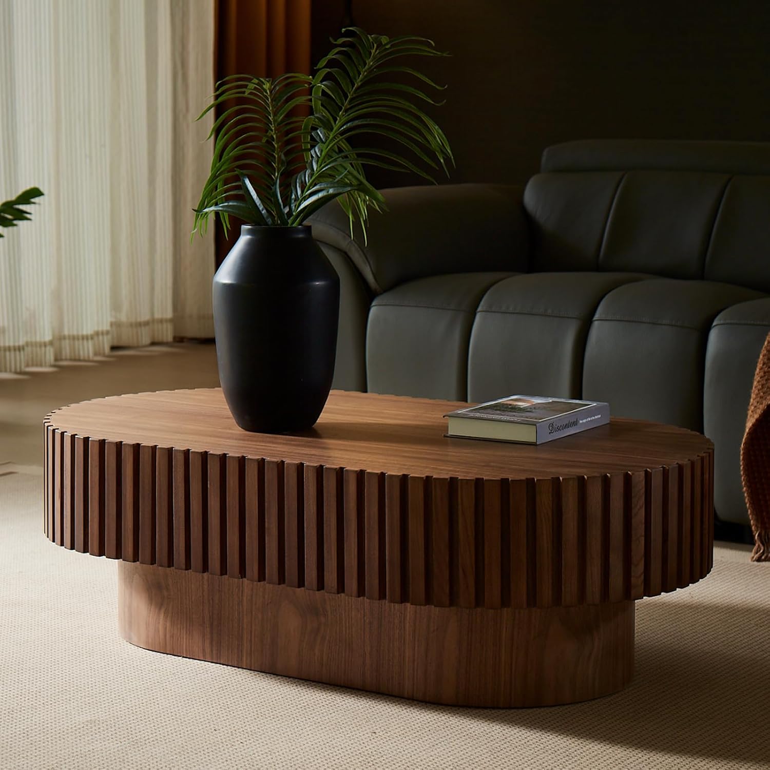 43.7" Oval Coffee Table for Living Room,Modern Handcraft Drum Coffee TableSmall Wooden Coffee Table with Sturdy Pedestal Easy Assembly for Office-Walnut