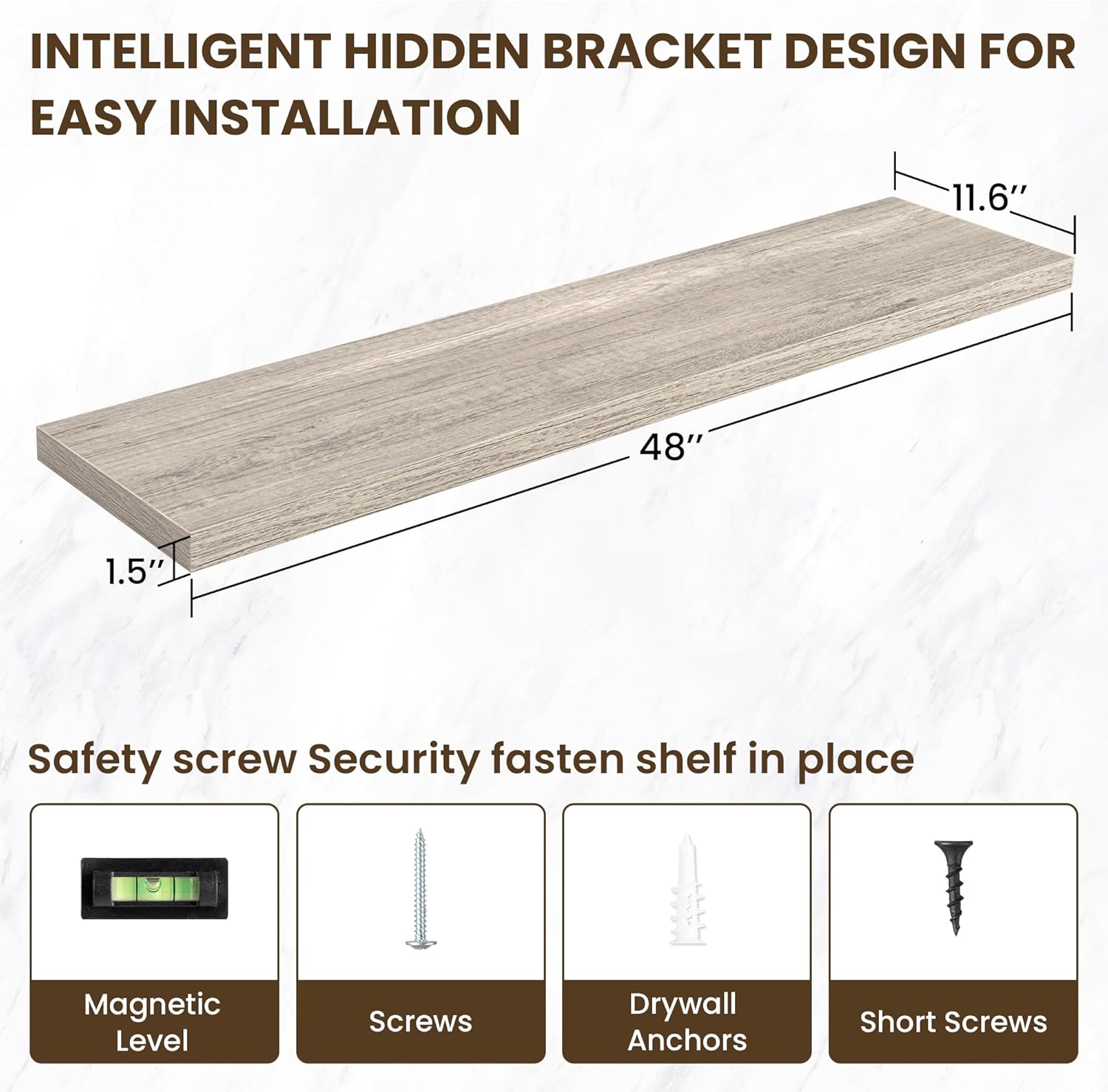 - 【Premium Quality Construction】Crafted from high-grade engineered wood with an invisible one-piece bracket, these floating shelves offer a robust and sleek design. The rustic wooden grain finish not only adds a touch of elegance but also infuses warmth into any room, making them a perfect fit for both modern and traditional interiors.