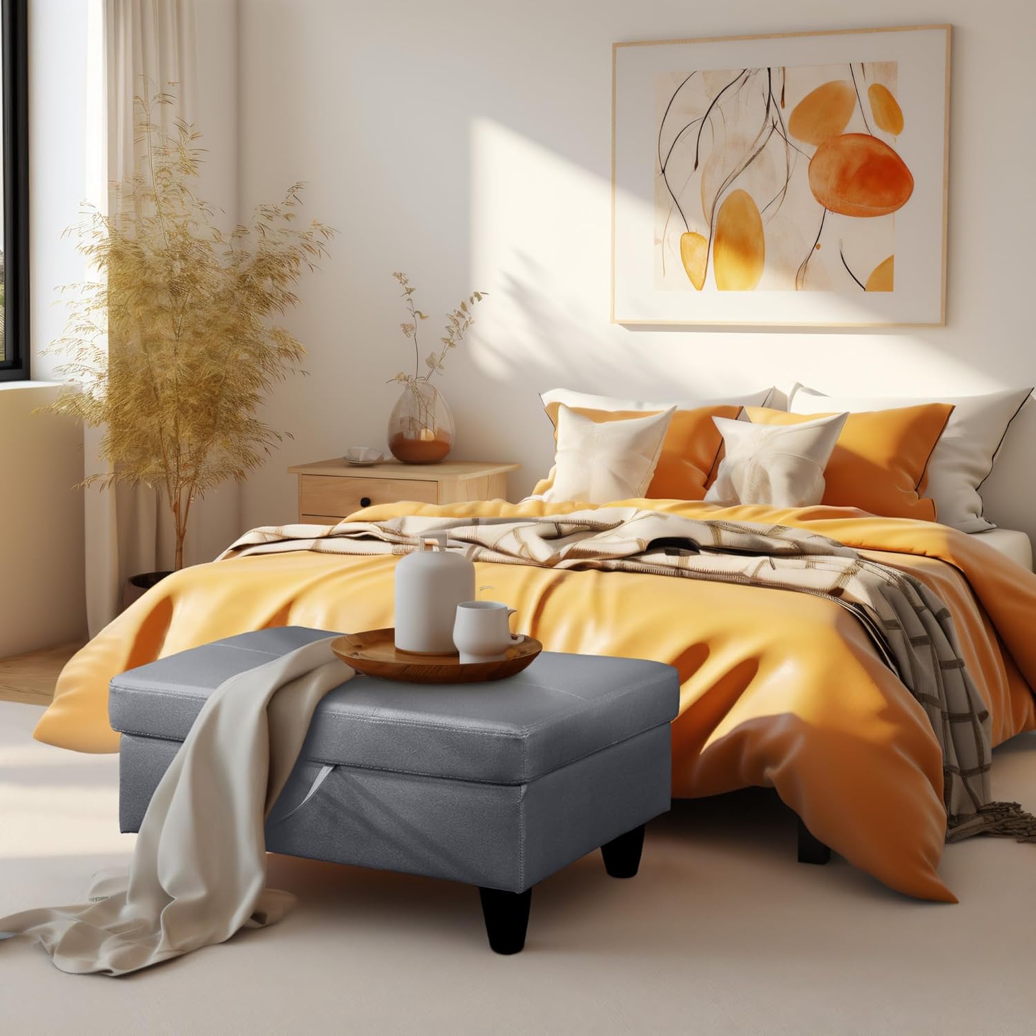- PREMIUM MATERIALS: This storage ottoman features a thick foam cushion for added comfort. Built with a sturdy solid wood frame and durable plastic feet, it offers long-lasting quality while protecting your floors from scratches. The easy-to-clean faux leather surface gives it a sleek, modern look, and the smooth faux leather lid adds an extra layer of comfort for sitting. Perfect for any room, this ottoman combines style, durability, and functionality.