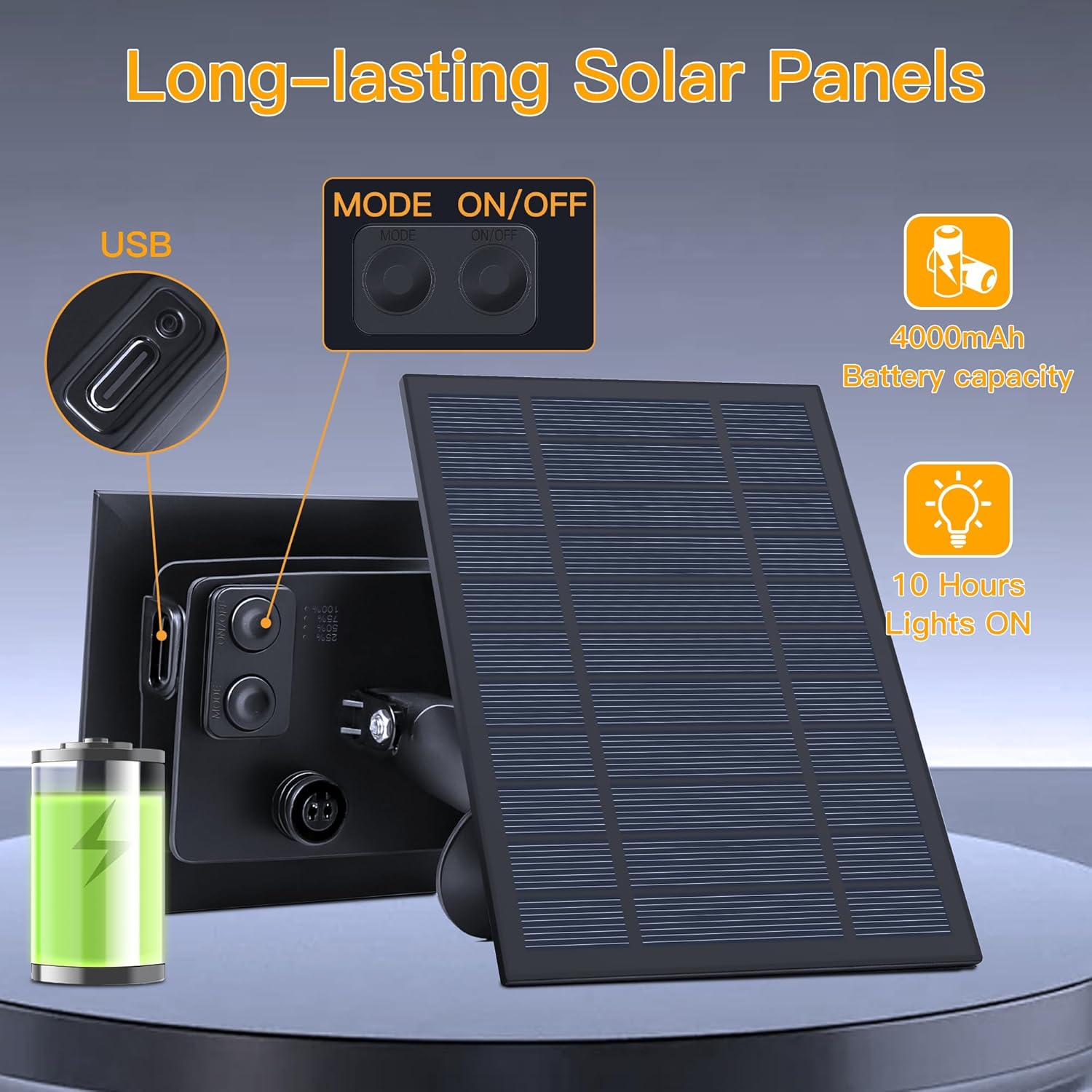 - [Auto ON/OFF Function] The solar panel features a built-in light sensor, enabling lights to automatically switch on at dusk and off at dawn. Key notes: 1. Press the ON button located behind the solar panel before initial use; 2. Ensure the solar panels are covered if used during daylight hours