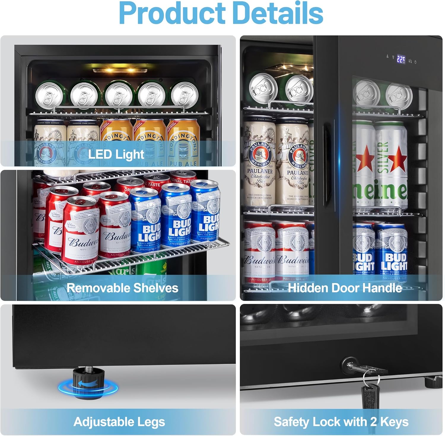 - Large Capacity: The counter beverage fridge can hold up to 120 standard beer cans; 3 removable shelves and a grid divide the storage space into 4 different sizes areas; Such a compact design can satisfy you to store different sizes of drinks
