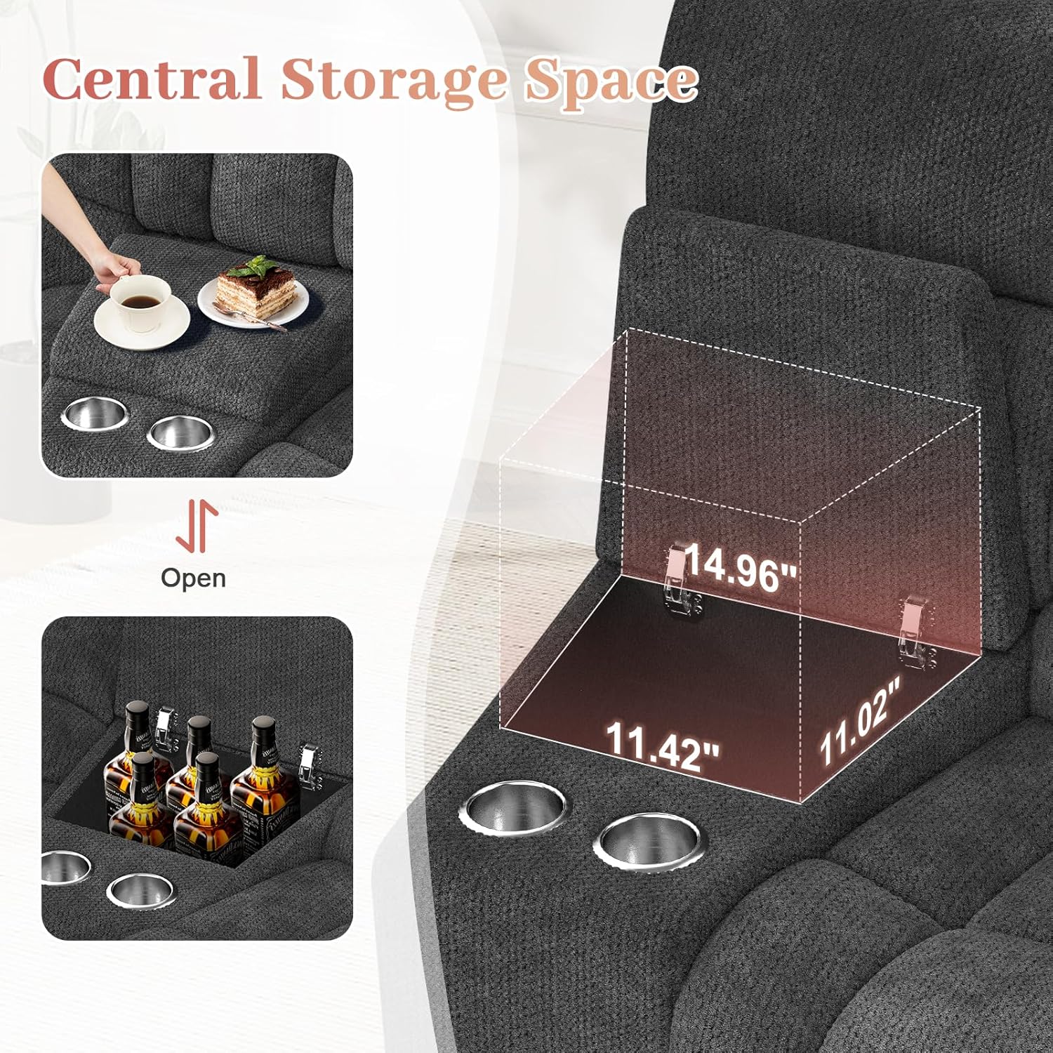 - CONVENIENT CENTRAL STORAGE SPACE: This home theater seating also comes with a convenient central storage space, size: 14.96"D x 11.02 "W x 4.72"H. It's an ideal place to keep your beloved game consoles and remote controls. The flip lid is easy to use and you can equally place snacks and treats while enjoying your film or gaming experience. The configured cup holders make it quick and easy to grab a drink or popcorn without having to get up from your seat.