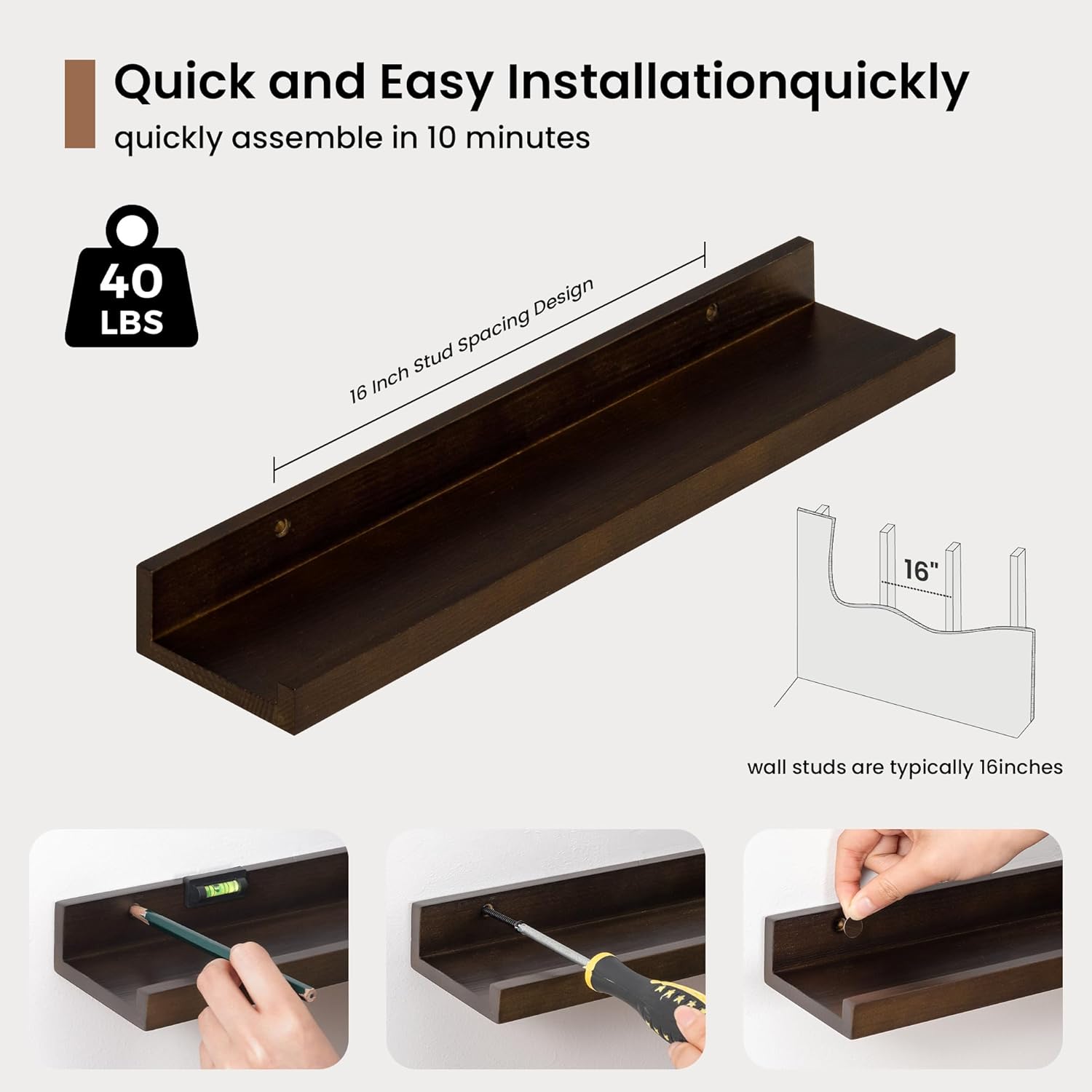 - 3.5" Floating Picture Ledge: Anti-Slip Narrow Design-3.5" ultra-narrow depth holds frames/plants without sliding, even on angled walls. Stud-Mounted Stability-16" pre-drilled holes match standard studs (hardware incl.) for wobble-free install. Clutter-Free Aesthetic-Clean lines blend with farmhouse/Scandinavian decor, focusing on your treasures
