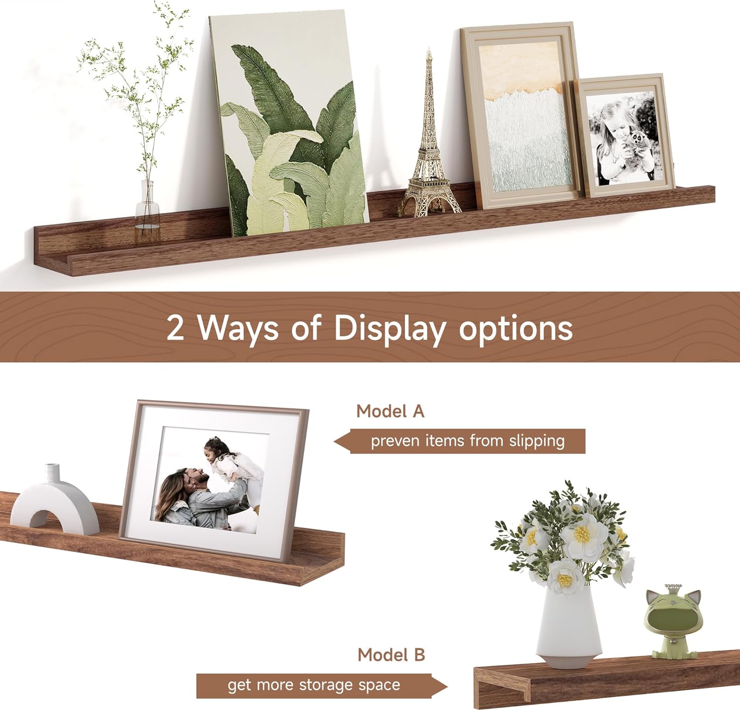 - MEMORIES SHOWCASE SHELF: Do you have a lot of memorable photos, but don't know how to display them, Fun Memories picture ledge shelves (especially in large sizes) are perfect for you to display them! With our hanging racks, you can store and display different types and sizes of photo frames in one place without worrying about