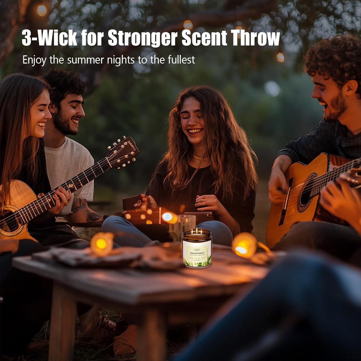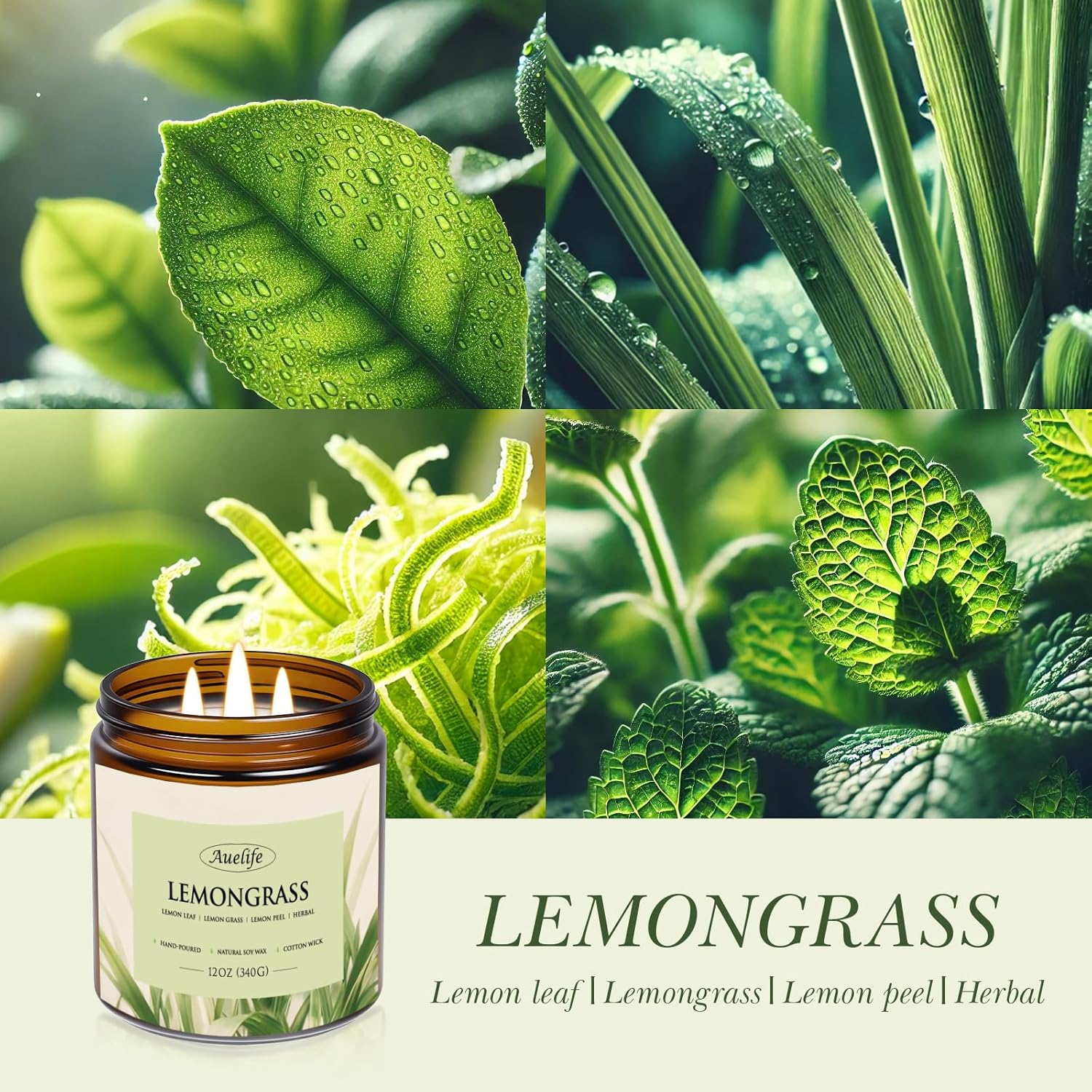 Auelife Lemongrass Scented Candle | 3-Wick Jar Candle - 12oz Natural Soy Wax - Citronella Scent for Indoor Outdoor Use, Long Lasting Aromatherapy Gifts for Fathers Day, Summer, 50+ Hour Burn