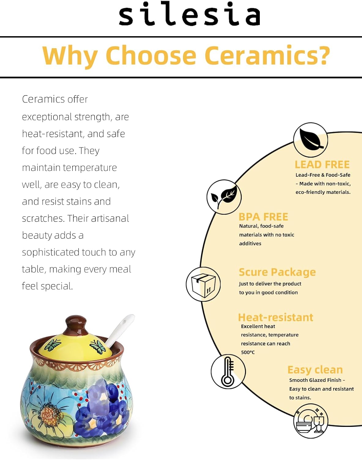 - Beautiful Hand-Painted Design: The sugar bowl features a unique, hand-painted design, showcasing vibrant colors and intricate patterns. This artisanal touch adds charm and character, making it a perfect decorative piece for your kitchen or dining table. Each piece is slightly different, reflecting the craftsmanship behind it