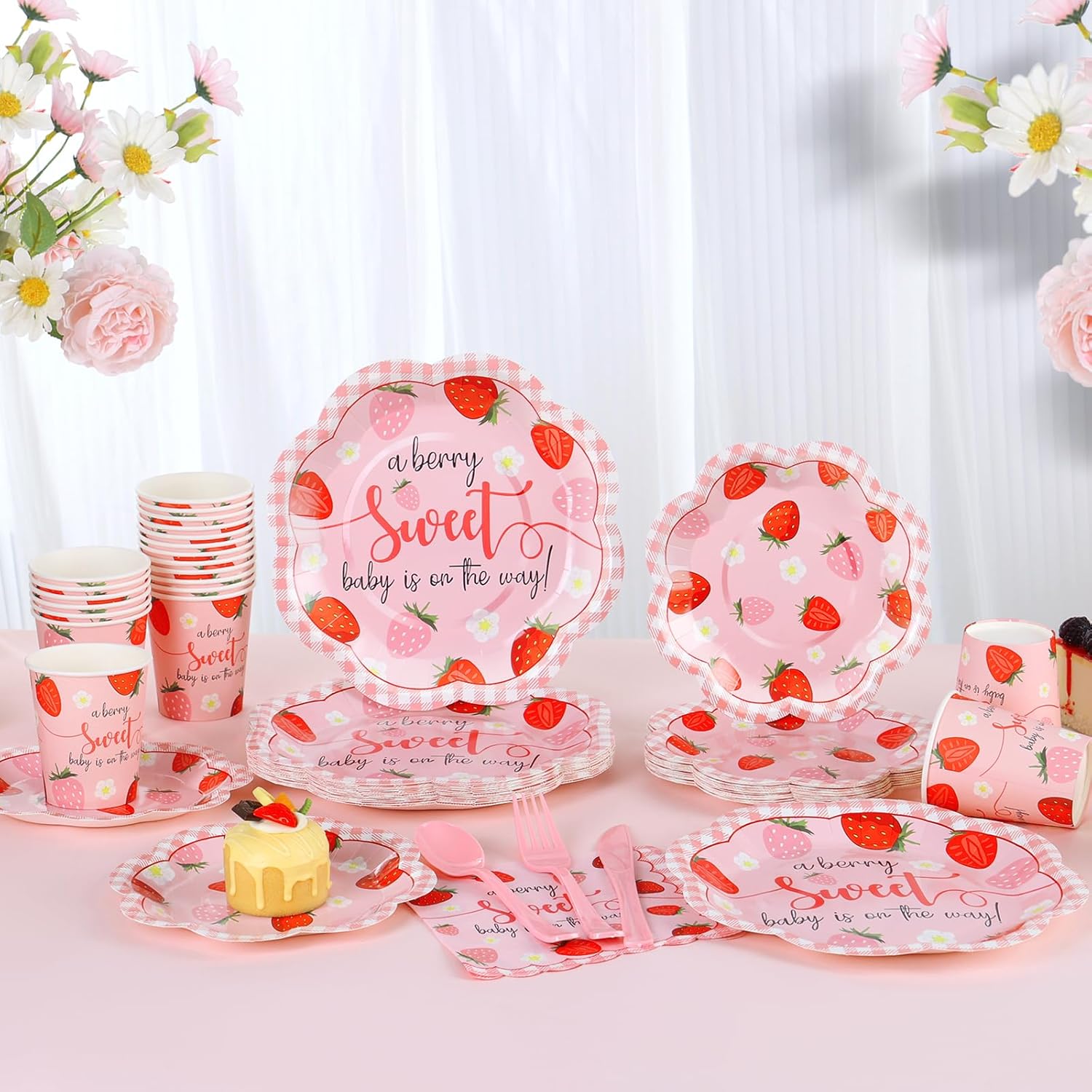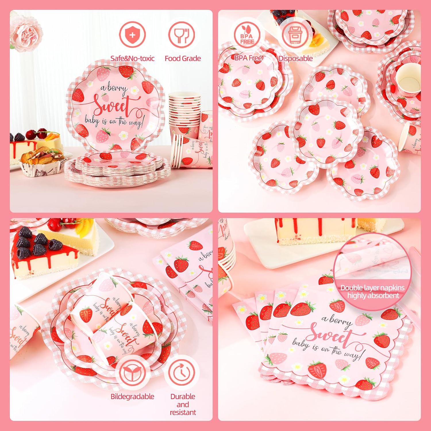 Strawberry Baby Shower Decorations for Girl, Berry Sweet Baby Shower Plates and Cups and Napkins Sets Serves 24, Strawberry Plates, A Berry Sweet Baby Is On The Way Decorations, Girl