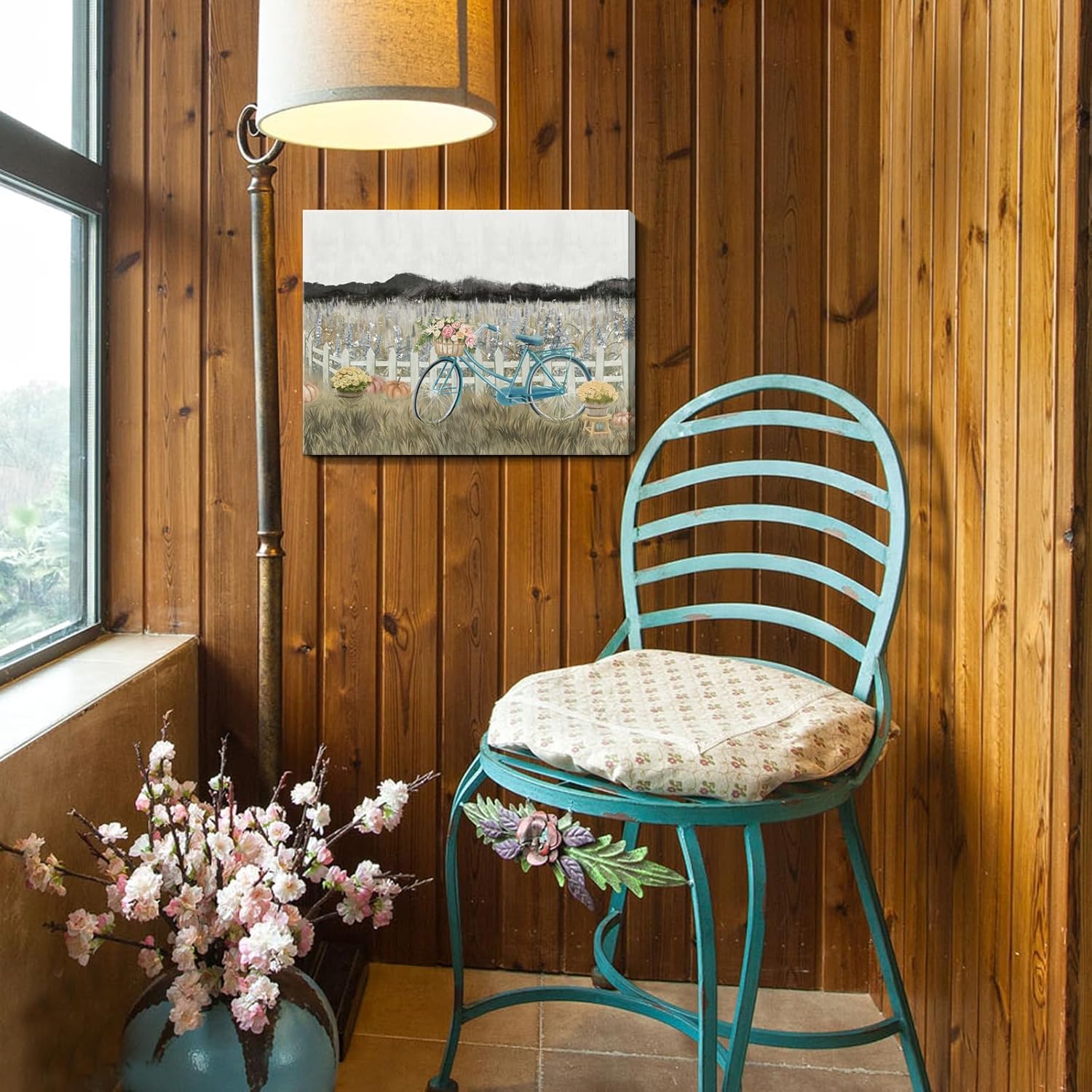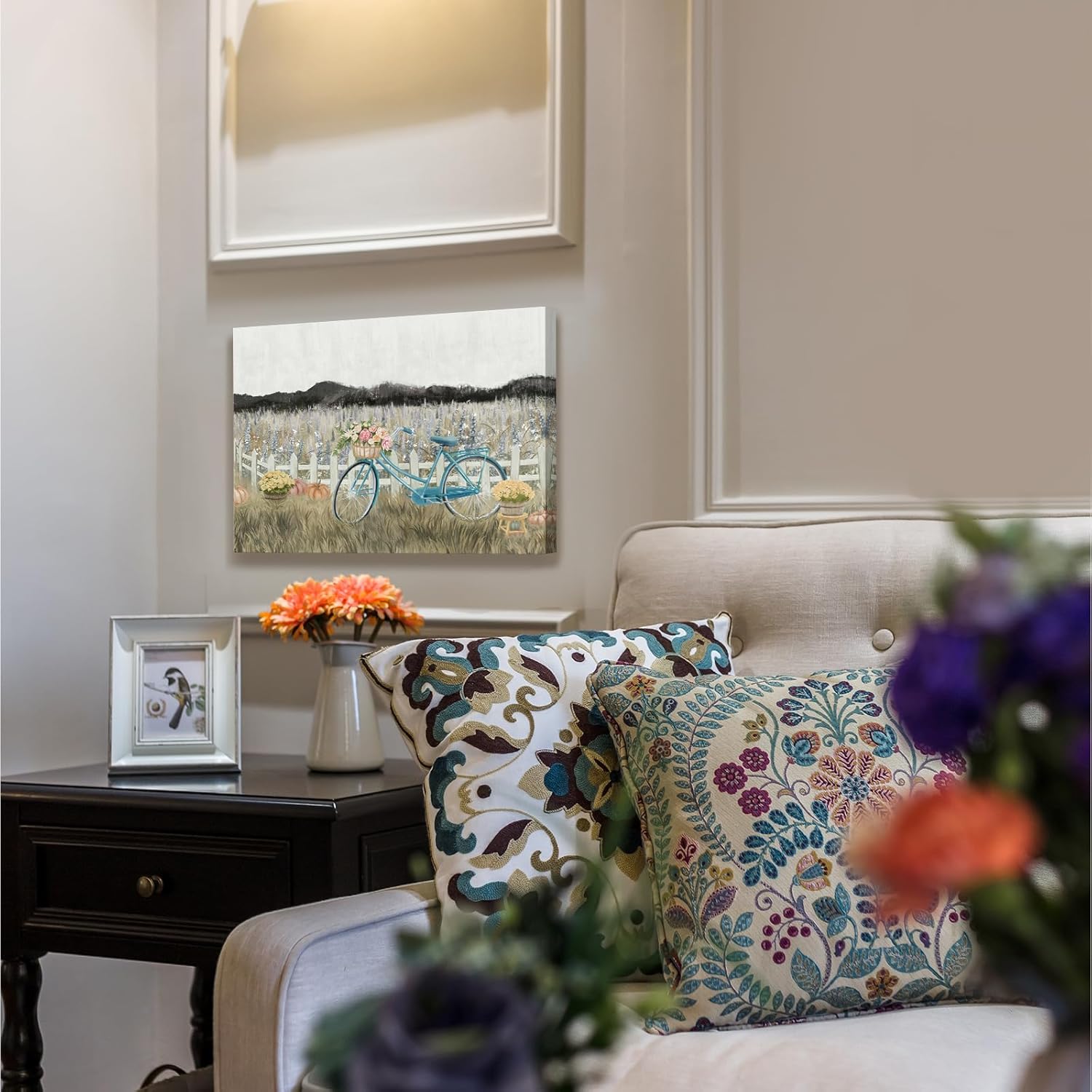 - Versatile Modern Farmhouse Wall Decor. This canvas wall art blends modern farmhouse style with vintage charm, featuring a blue bicycle, floral basket, pumpkins, and a rustic picket fence. With soft beige, taupe, and warm brown tones, it adds warmth and character to bedrooms, bathrooms, kitchens, and more—perfect for those who love neutral, earthy decor.