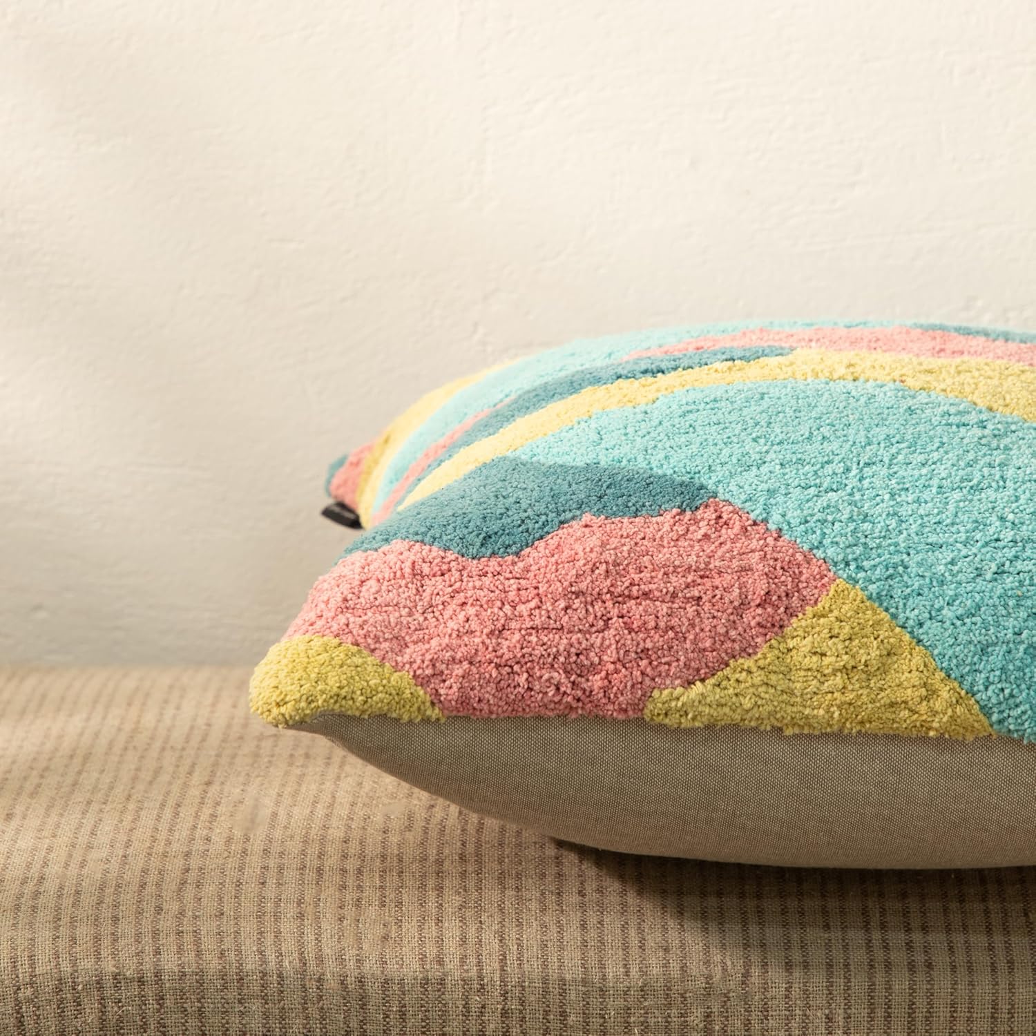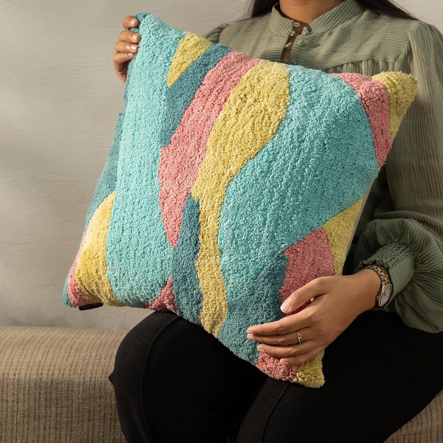 - Vibrant Colors: This throw pillow cover features a captivating design with bold stripes in shades of yellow, green, gray, and pink.