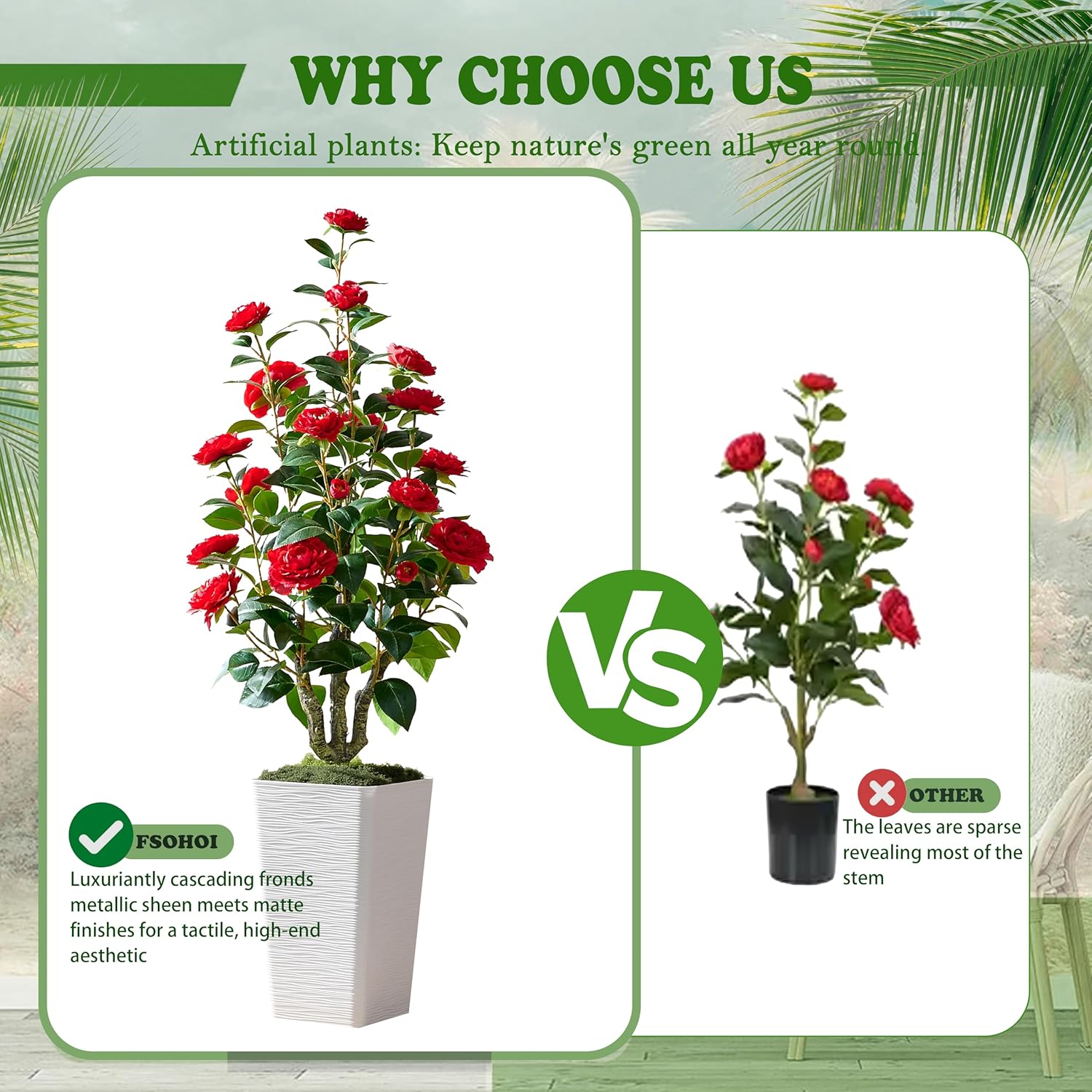 - 🌸 Lifelike Camellia Trees: FSOHOI fake trees are meticulously crafted to mimic the appearance of real plants, being as close to the genuine article as possible; Especially referring to the blooming camellias, which are lifelike and have dense foliage; they appear vibrant and perfectly adorn your life. Artificial tree is made from high-quality materials, making it safe and realistic