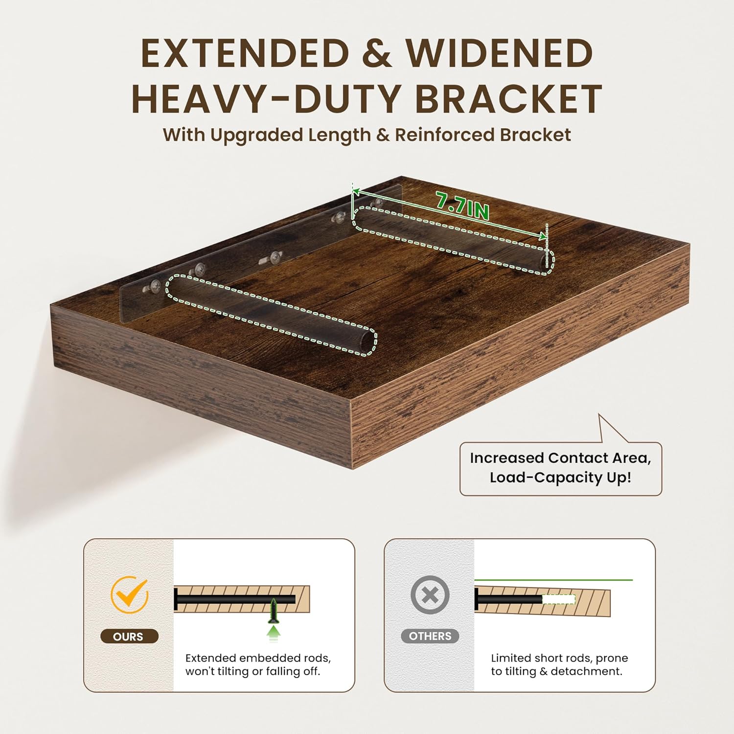 - UPGRADED MOUNTING SYSTEM-The extended supporting bars on the metal brackets ensure our wall shelves remain sturdy, preventing any wobbling or sagging. Plus, the included plastic plugs guarantee the shelves to stay firmly in place