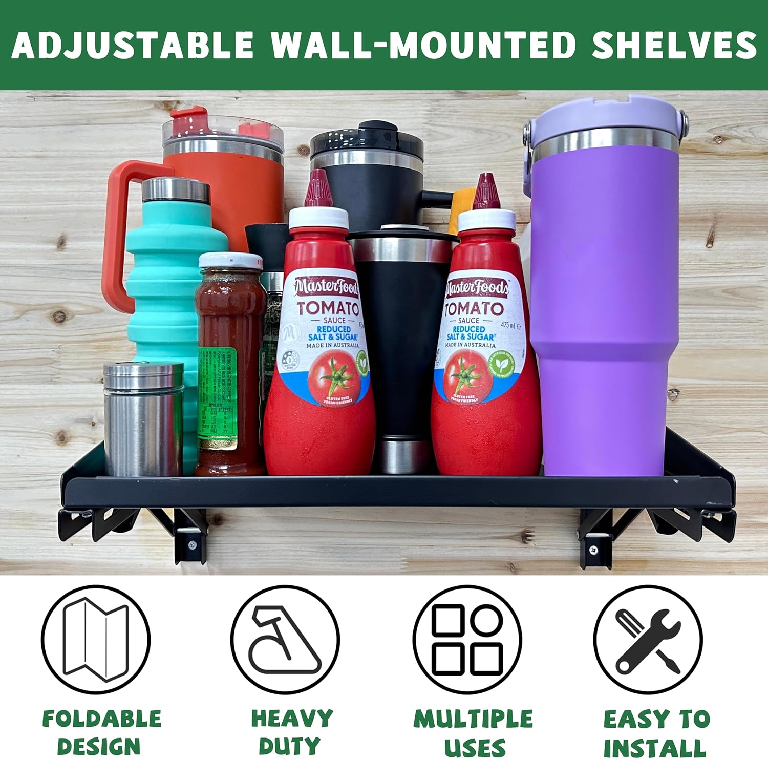 - [Space Saving Adjustable Rail Shelf]: The wall mounted shelf is an ideal solution for optimizing space. Because it can easily fold flat against the wall when not needed, instantly free up valuable floor space. keeping your garage organized and tidy
