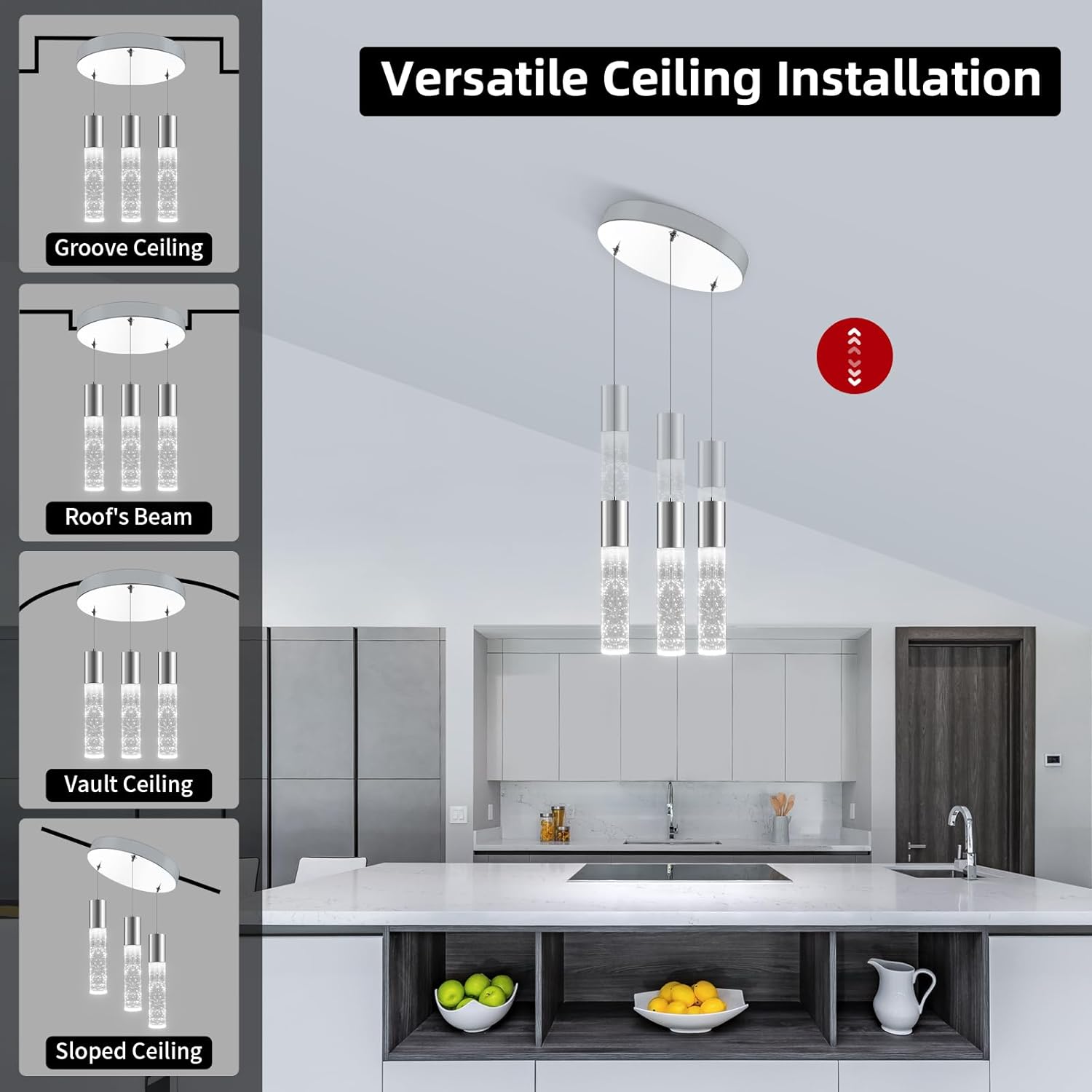 OKELI Smart Dimmable LED 3-Light Pendant Light for Kitchen Island, 18W 1350LM Modern Bubble Crystal Island Light Fixture with TUYA App & Voice Control, Adjustable 3000K-6000K, Electro-Chrome, Round