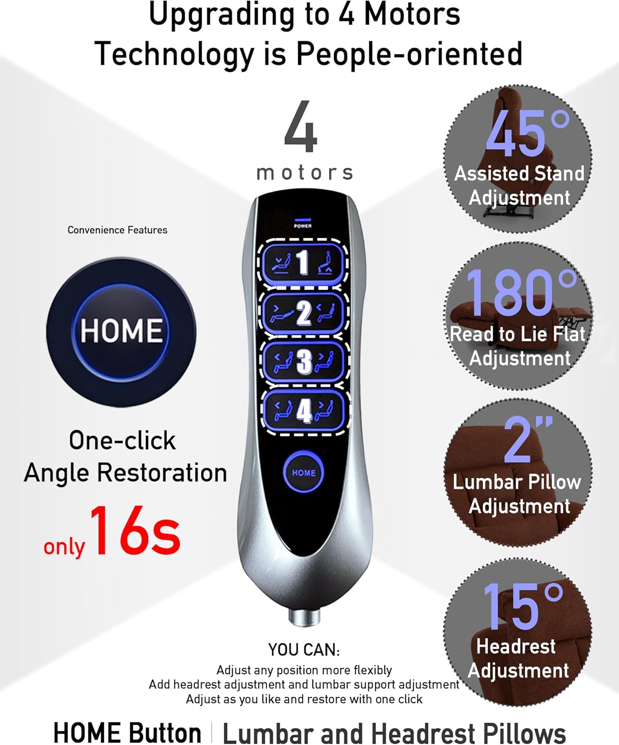 - This power recliner is controlled by a remote control with 4 built-in motor drives to adjust the backrest leg rest; compared to the general button control, it is more convenient, not affected by the sitting position, and lie flat recliner can provide a variety of applicable angles, the maximum expansion angle of 180 °, suitable for daily reading, watching TV, lying down to rest, power recliner backrest and leg rest can be independently adjusted to achieve wireless position!