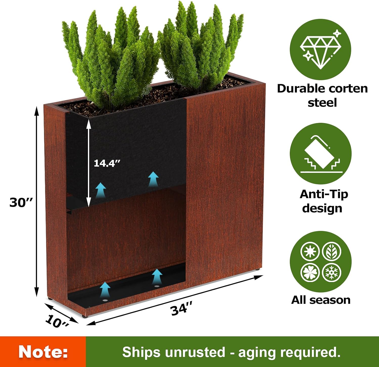 - Durable and Weather-Resistant: Built to last, corten steel is highly resistant to corrosion and damage from harsh weather, ensuring the outdoor planter box remains strong and functional for years