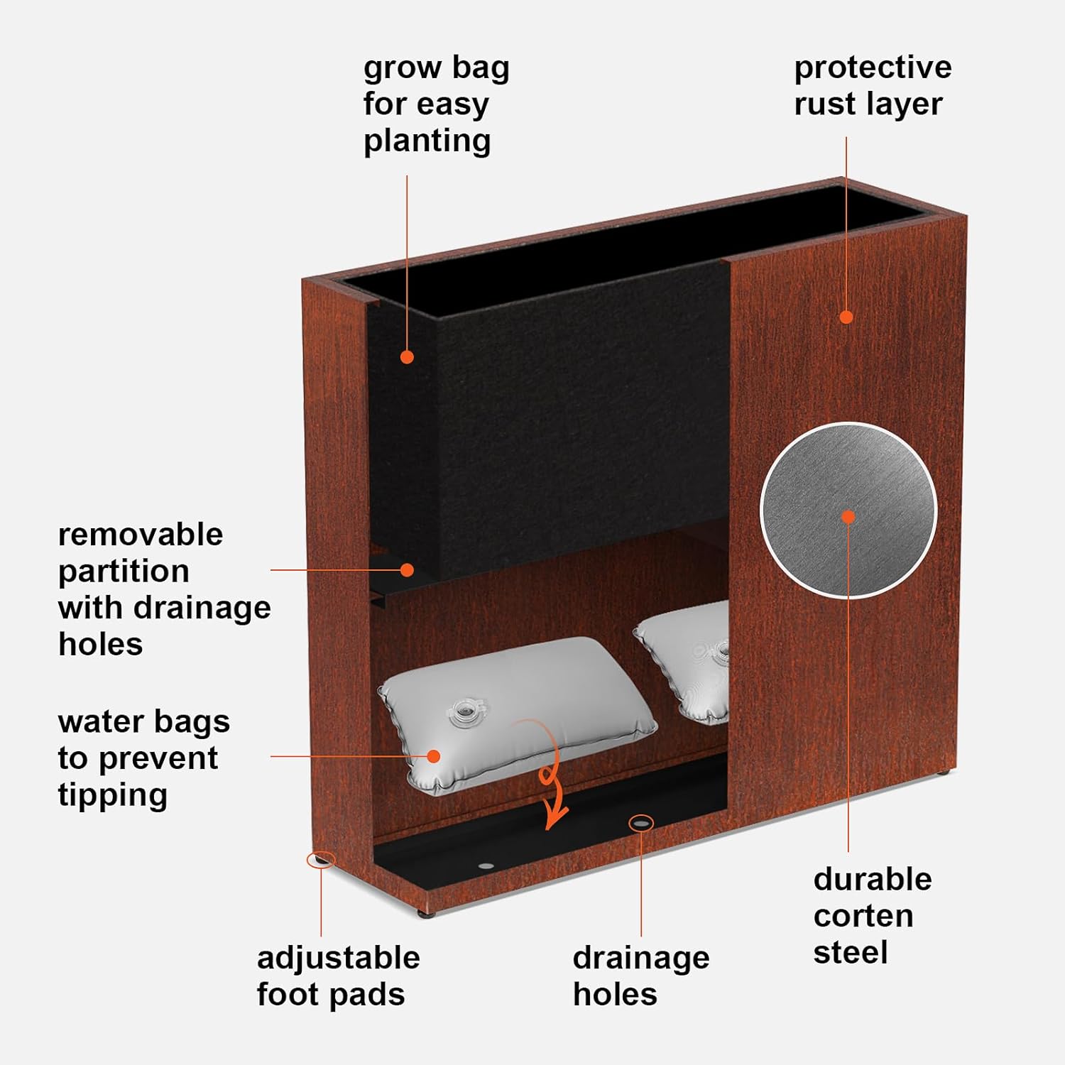 - Anti-Tipping Stability: Our corten steel planter comes with a grow bag for clean and convenient planting and water bags to enhance stability and can withstand a maximum tilting force of 30bf