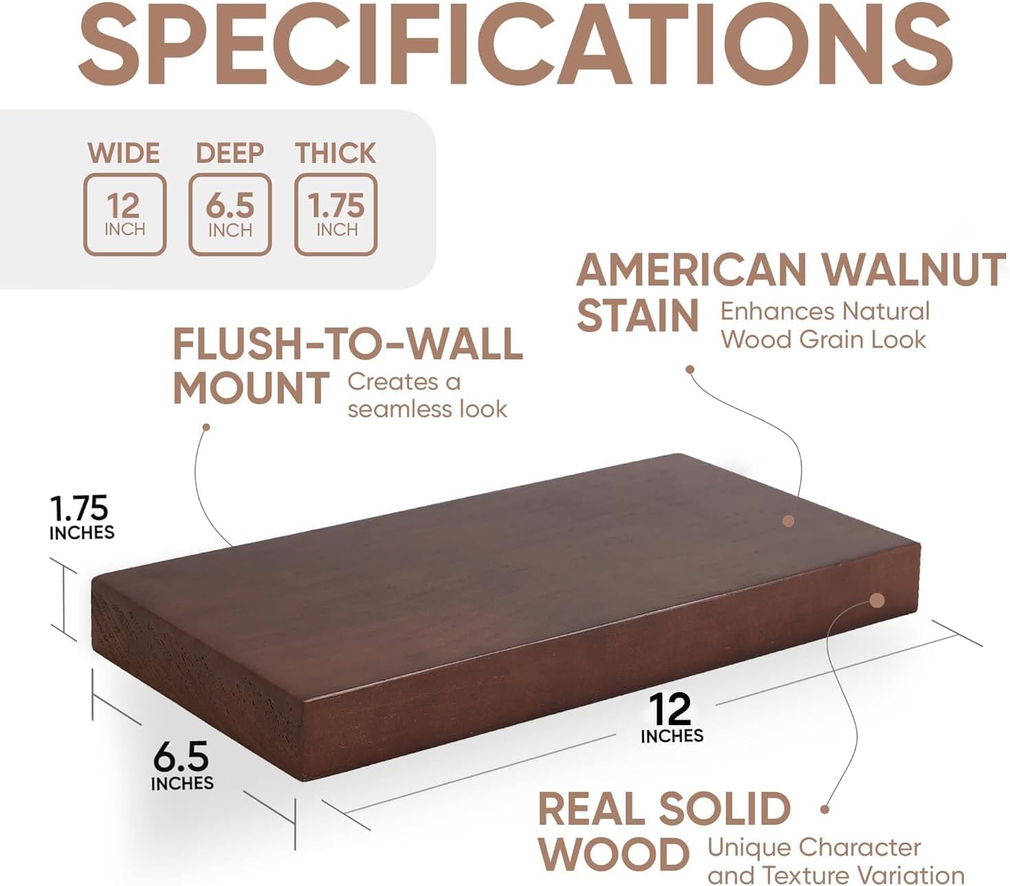 - AUTHENTIC WOOD GRAIN - Enjoy the timeless elegance of real wood. Handcrafted from the finest 1.75" Thick natural pine wood measuring 12" Wide x 6.5" Deep x 1.75". Our shelves highlight the inherent charm and durability of high-quality wood. Each Shelf reveals its unique character of knots and natural wood grain; each ledge is a little different but equally stunning.