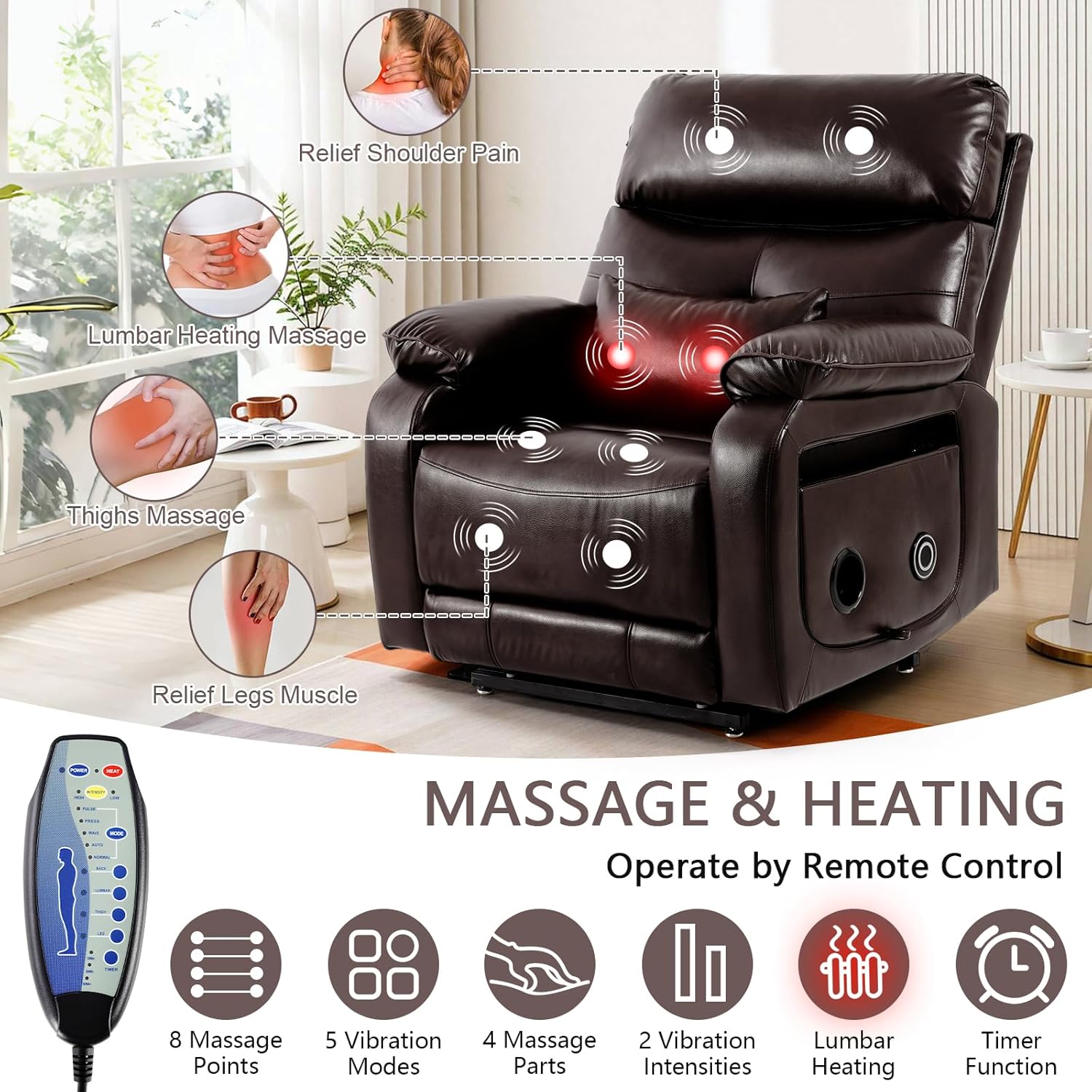 - 【Massage & Lumbar Heating】Eight massage points are distributed across the back, waist, thighs, and legs, with five massage modes and adjustable vibration intensity for a fully customizable experience. The lumbar heating function improves circulation and relieves waist pressure, making it perfect for anyone looking for a heated lift chair or massage recliner chair