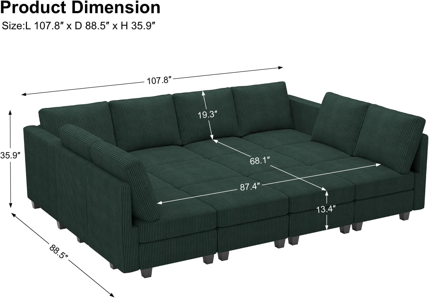 Belffin Oversized 12 Seat Modular Sectional Sleeper Sofa Convertible Sleeper Sectional Sofa with Storage Seat Large Corduroy Modular Couch for Living Room Green