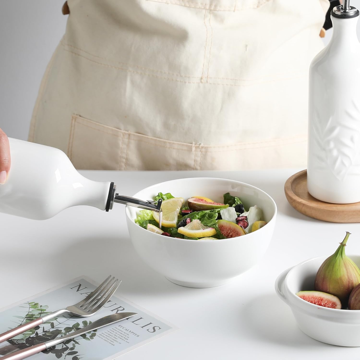 Sweejar Ceramic Olive Oil Dispenser Bottle, 20 Oz Relief Opaque Oil Cruet Protects To Reduce Oxidation, Suitable for Storage,Vinegar, Soy Sauce,Liquids,Set of 2 (White White)