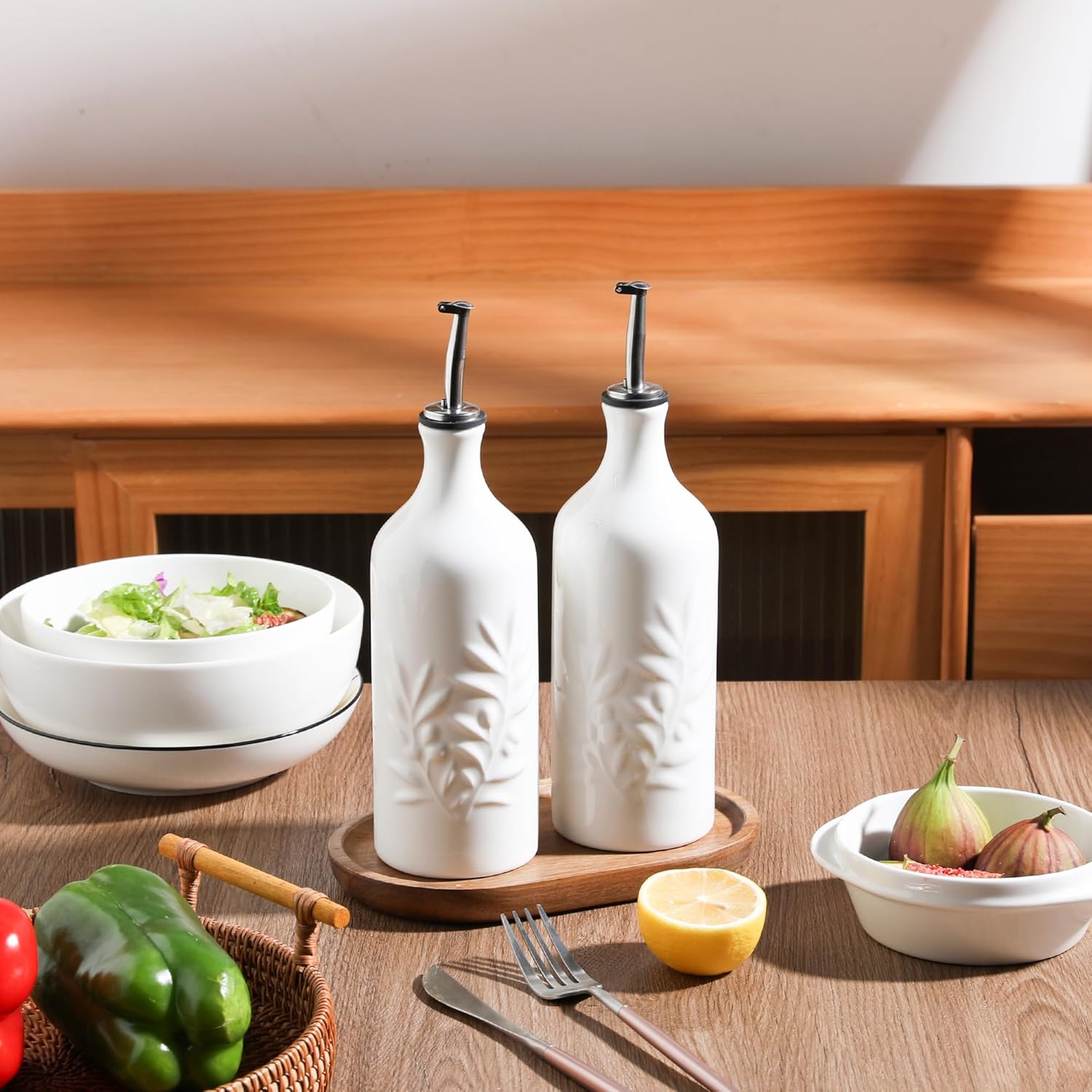 - Multi-Scenario Usage - Each set includes two oil bottles and a matching wood stand The 20 oz size makes this vinegar bottle dispenser light and compact, easy to carry and store. It can be widely used in family kitchen, restaurant, bar, cafe, hotel, party, buffet, barbecue and other places.