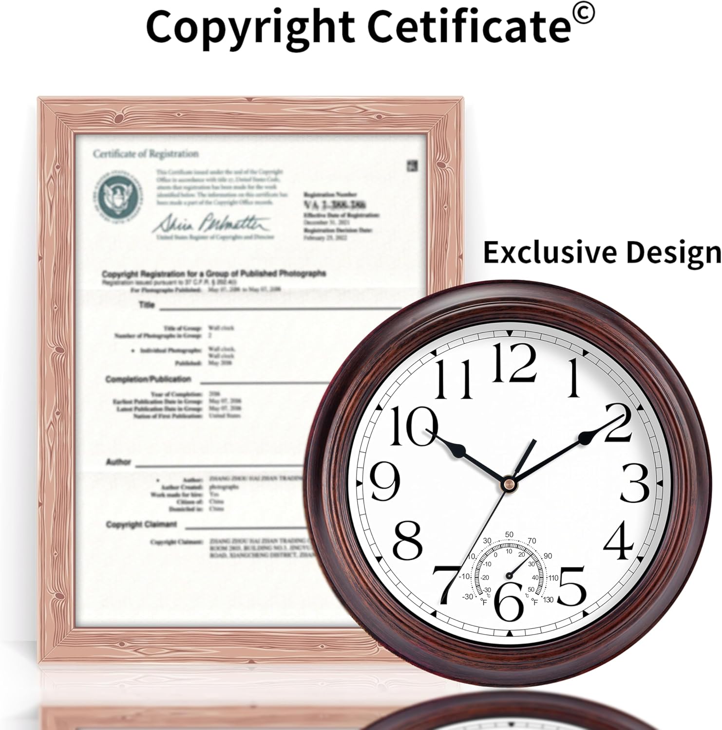 8.5 Inch Outdoor Wall Clock with Thermometers, Vintage Silent Wall Clocks Battery Operated, Retro Non-Ticking Clock Decorative for Living Room, Patio, Kitchen, Office, Bathroom, Bedroom(Bronze)