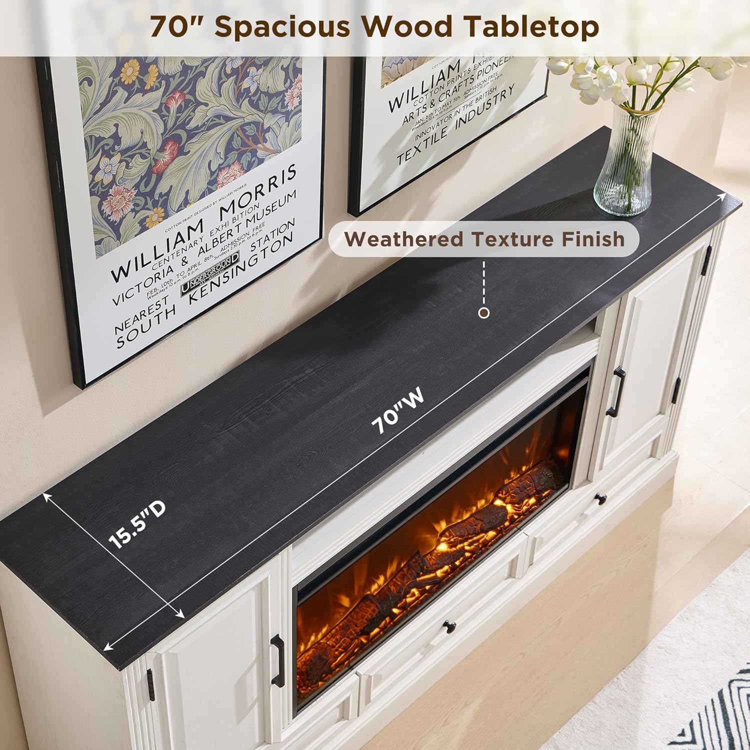 - Durability You Can Trust: Built with high-quality MDF and reinforced particleboard, this farmhouse tv stand with fireplace is made to last for years. The solid 1-inch thick tabletop, which supports up to 150 lbs, and the 3-inch high wooden support base ensure unmatched stability. The well-structural design, combined with reinforced panels, guarantees superior strength and durability, making this media console a long-lasting addition to your home
