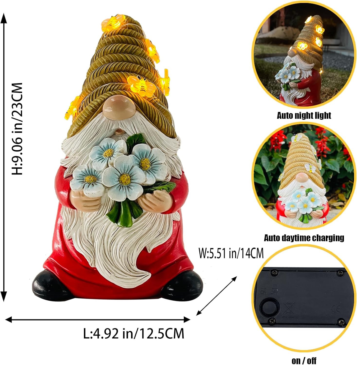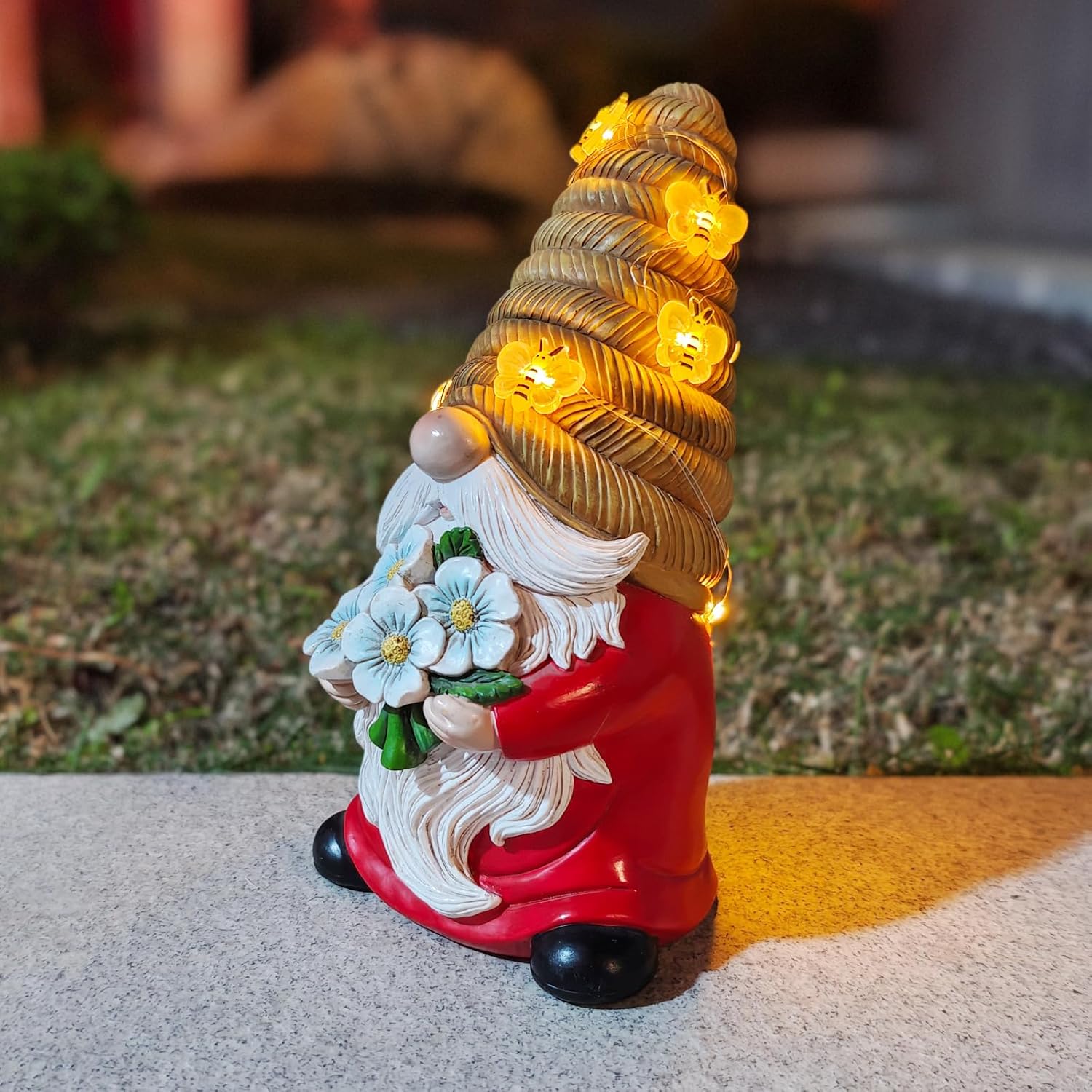 Outdoor Garden Gnomes Statue, Bee Flower Gnome Sculpture, with Solar LED Lights for Yard, Patio, Lawn Ornaments for Garden, Patio Gnome Gifts for Mom