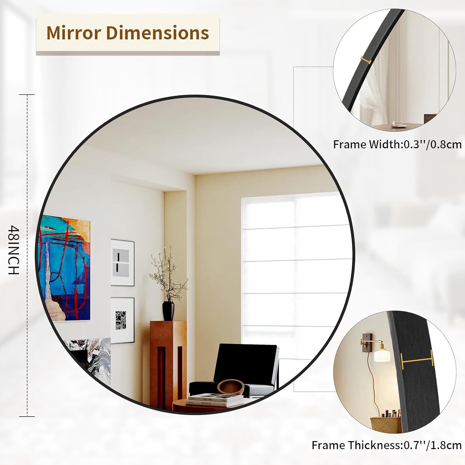 - Decorative Mirror: 48 inches diameter large round mirror can visually make your home more spacious and more inviting while can serving as functional wall art, Add a glamorous view to your walls, completing your modern, rustic, or farmhouse room decor