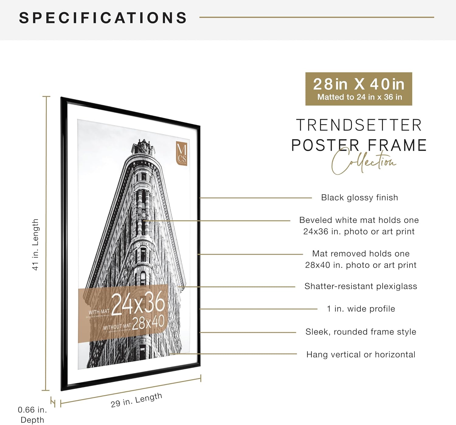 - DIMENSIONS: Each large wall picture frame features a sleek black profile & holds a 28 x 40-inch poster without the mat, or use the included mat for 24 x 36-inch display.
