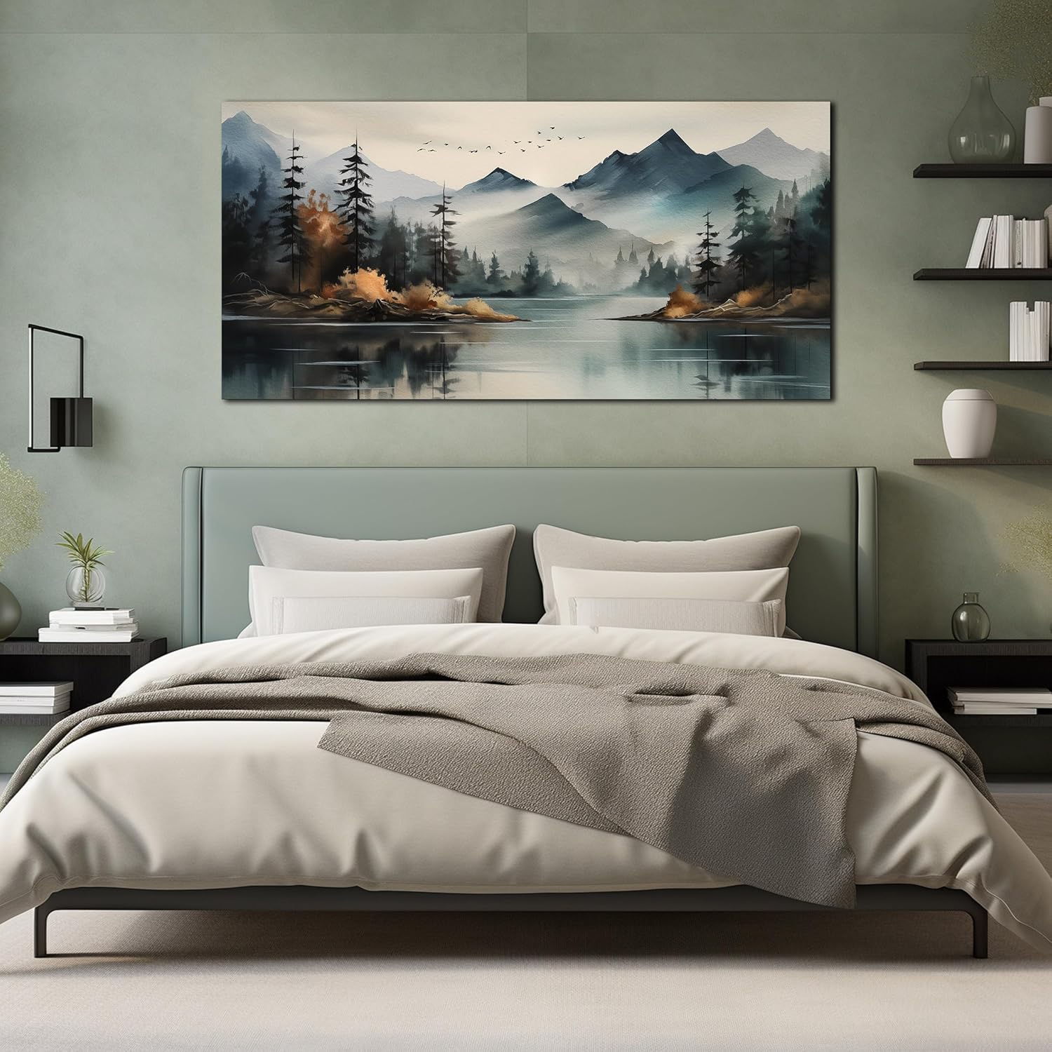 Rustic Wall Art for Living Room Large Size Teal Mountain Tree Landscape Canvas Wall Art for Bedroom Office Decor 29 x 59 Inch