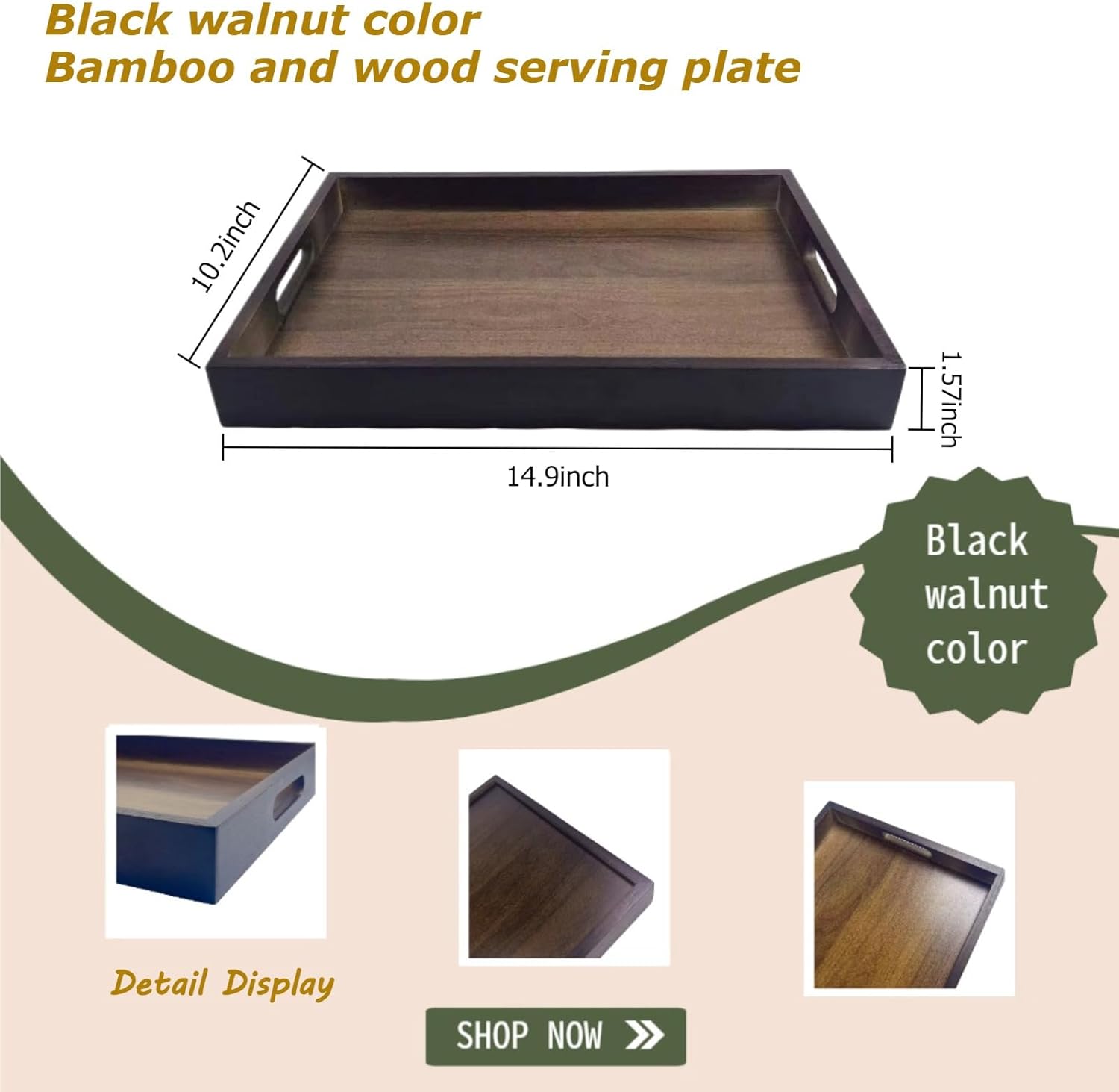 - Our rectangular wooden serving tray is made of natural and hard bamboo and wood, with a smooth surface and a mortise and tenon structure that is not easily broken or scattered. The appearance is simple, beautiful and generous. The unique black walnut color enhances its aesthetic appeal. But it's made of bamboo and wood.