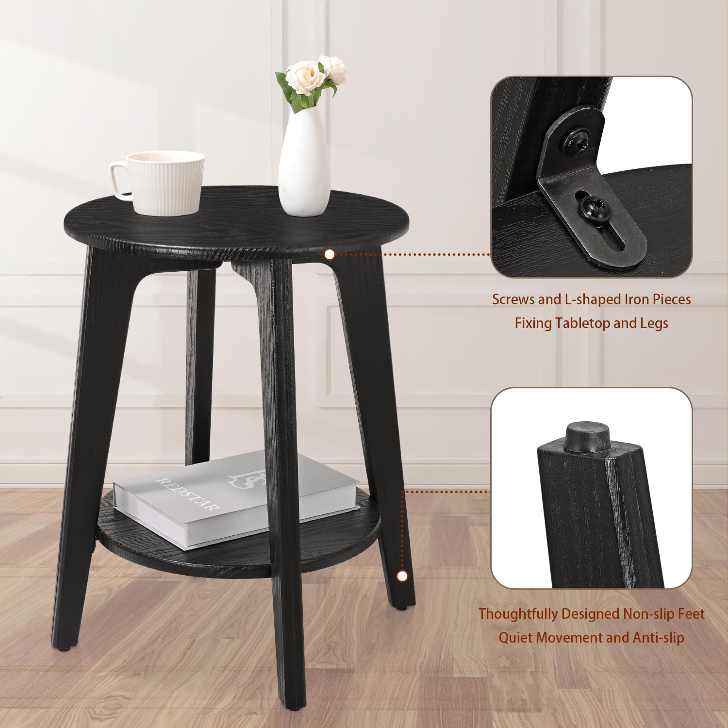 - High Quality & Unique Design: 2 round board as well as 4 legs made of solid wood form the stable foundation of this modern small round side table—this nightstand table boasts a stable, sturdy structure and can hold up to 200 lb in total