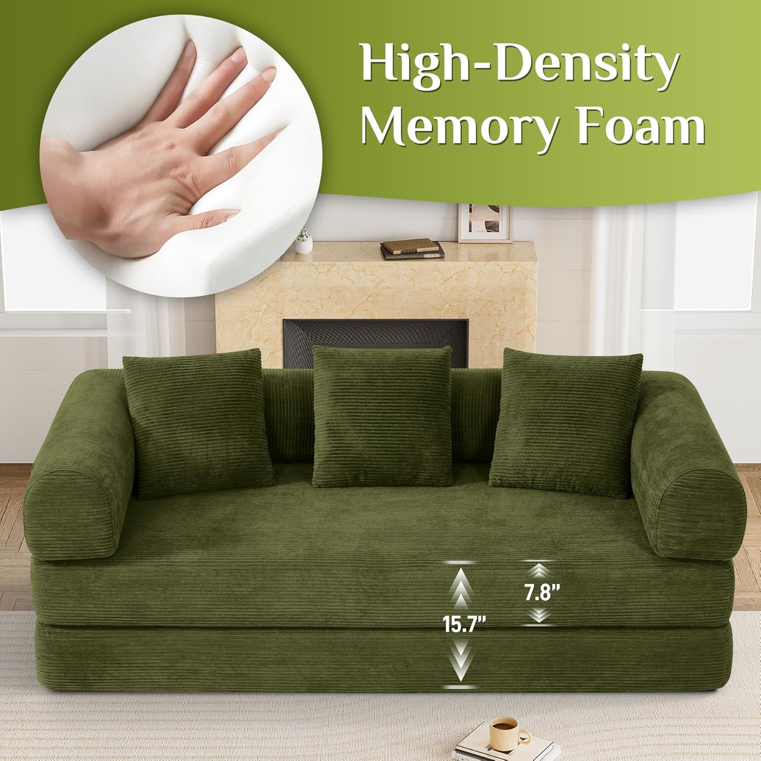 80.3" Convertible Sleeper Sofa Bed with Cylindrical Pillow, Corduroy Folding Mattress Couch with Fixed-Shape Frame, Modular Floor Sofa Lounge Couch for Living Room Bedroom Lounge, Green