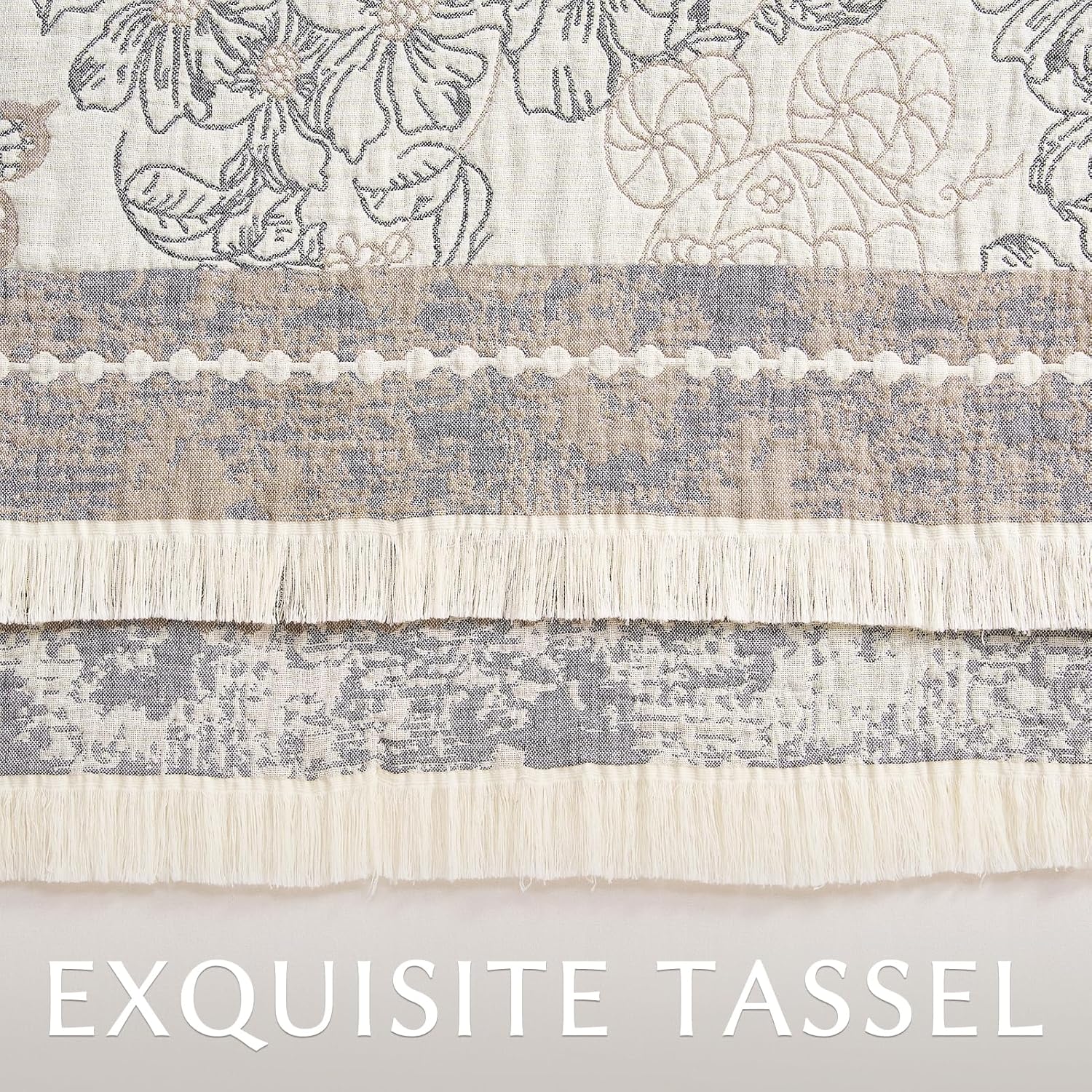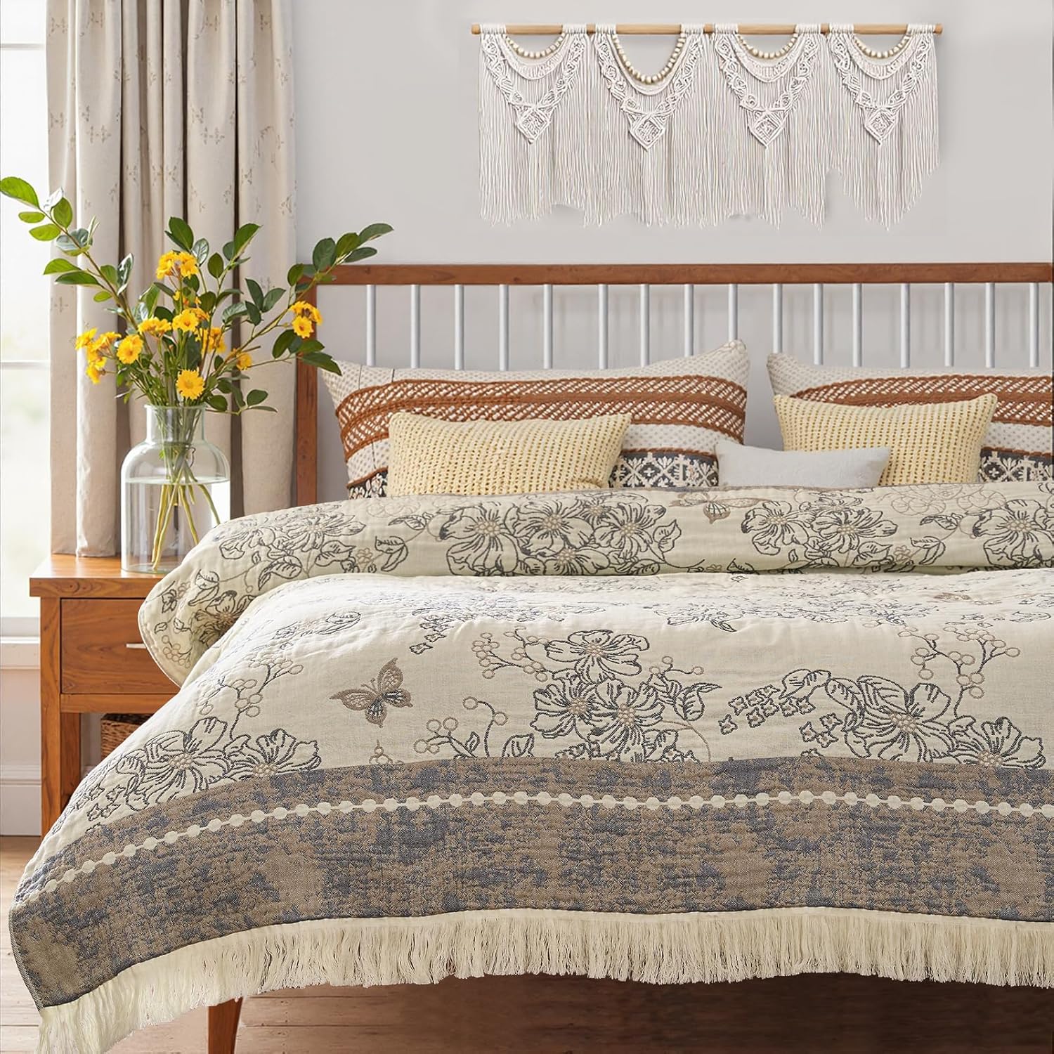 jinchan Boho Floral 100% Cotton Blanket 4-Layer Throw Blanket with Tassel Grey and White Flower Butterfly Soft Luxury Rustic Farmhouse Decor Blanket for Couch Bed 80x90 inch All Season Gift for Women