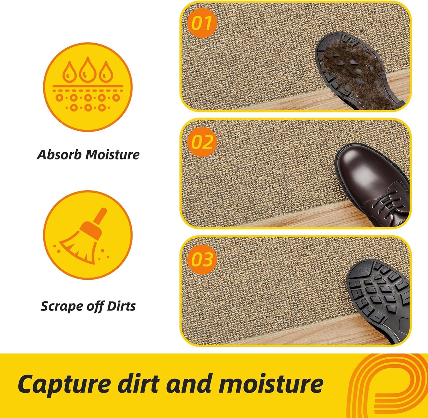 - TRAPS DIRT & MOISTURE: Engineered with tightly-woven polypropylene fibers, this entry mat effectively traps dirt and water from footwear. The high-density yarn structure resists stains while accelerating moisture evaporation, ensuring cleaner floors during rainy, snowy, or muddy days. Note: Natural lighting may cause slight color variations.