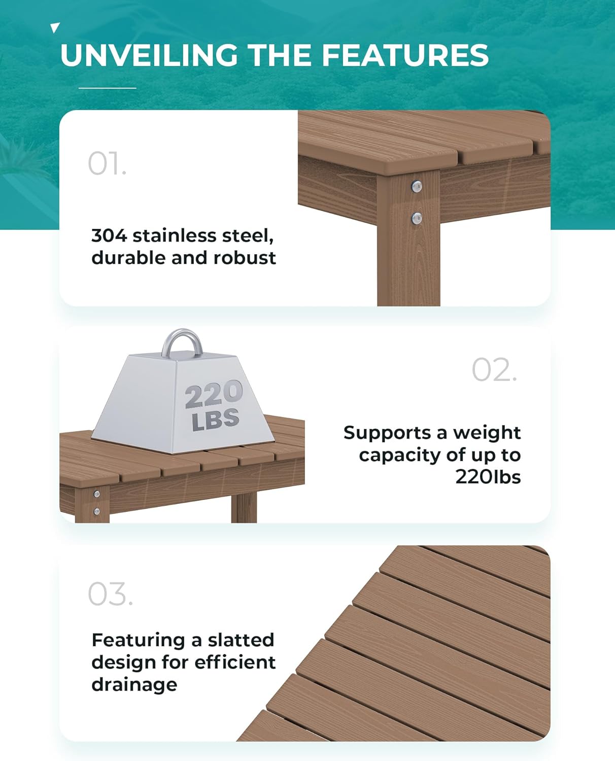 - Wood-like Texture: Offering the aesthetic appeal of wood without the upkeep, the SERWALL HDPE outdoor coffee table features a wood-textured surface that adds an elegant and natural touch to your outdoor decor. allowing you to have an outdoor experience just like real wood without the drawbacks of solid wood.