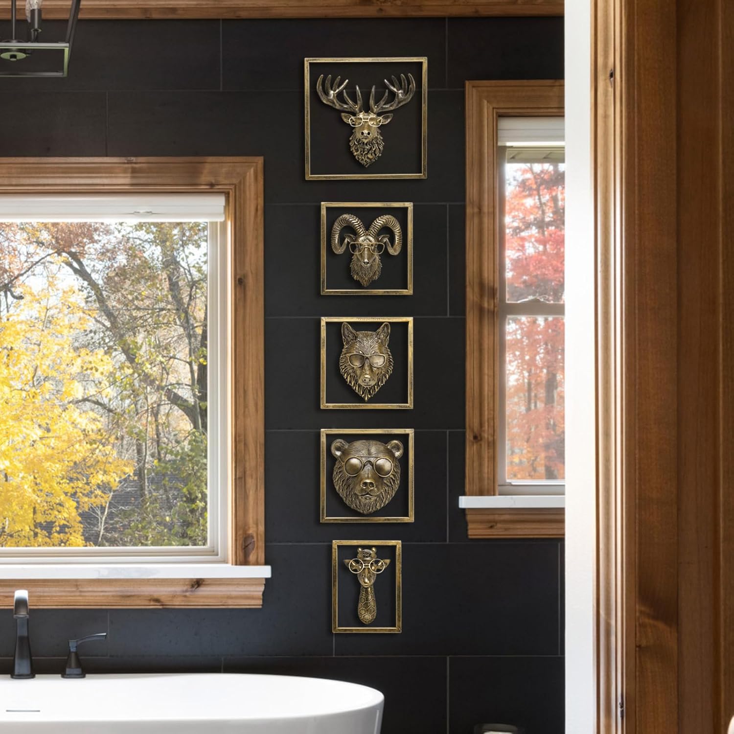 JJALIGHTS Animal Heads Wall Decor Resin Animals Sculptures Head Wall Hanging Decoration Imitation Copper vintage Wall Sculpture for Living Room Bedroom Office(5pcs,Includes Metal Frame)