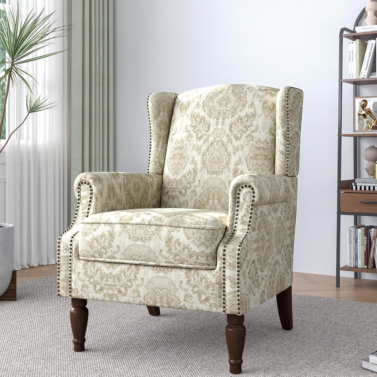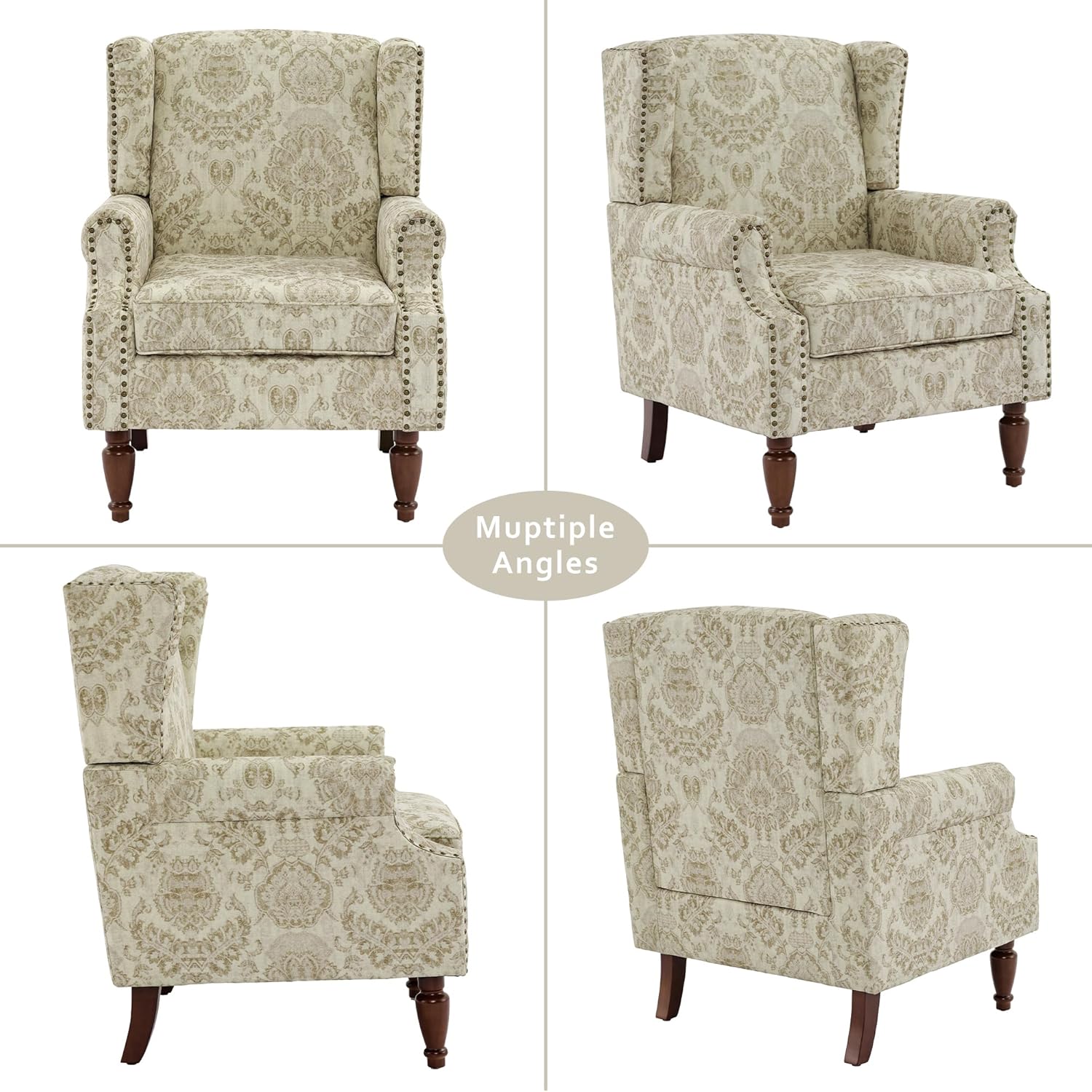 Lumibee Wingback Accent Chair,High Back Floral Armchairs in Fabric,Comfy Upholstered Reading Single Sofa Chair with Solid Wood Legs for Living Room,Bedroom,Office-White