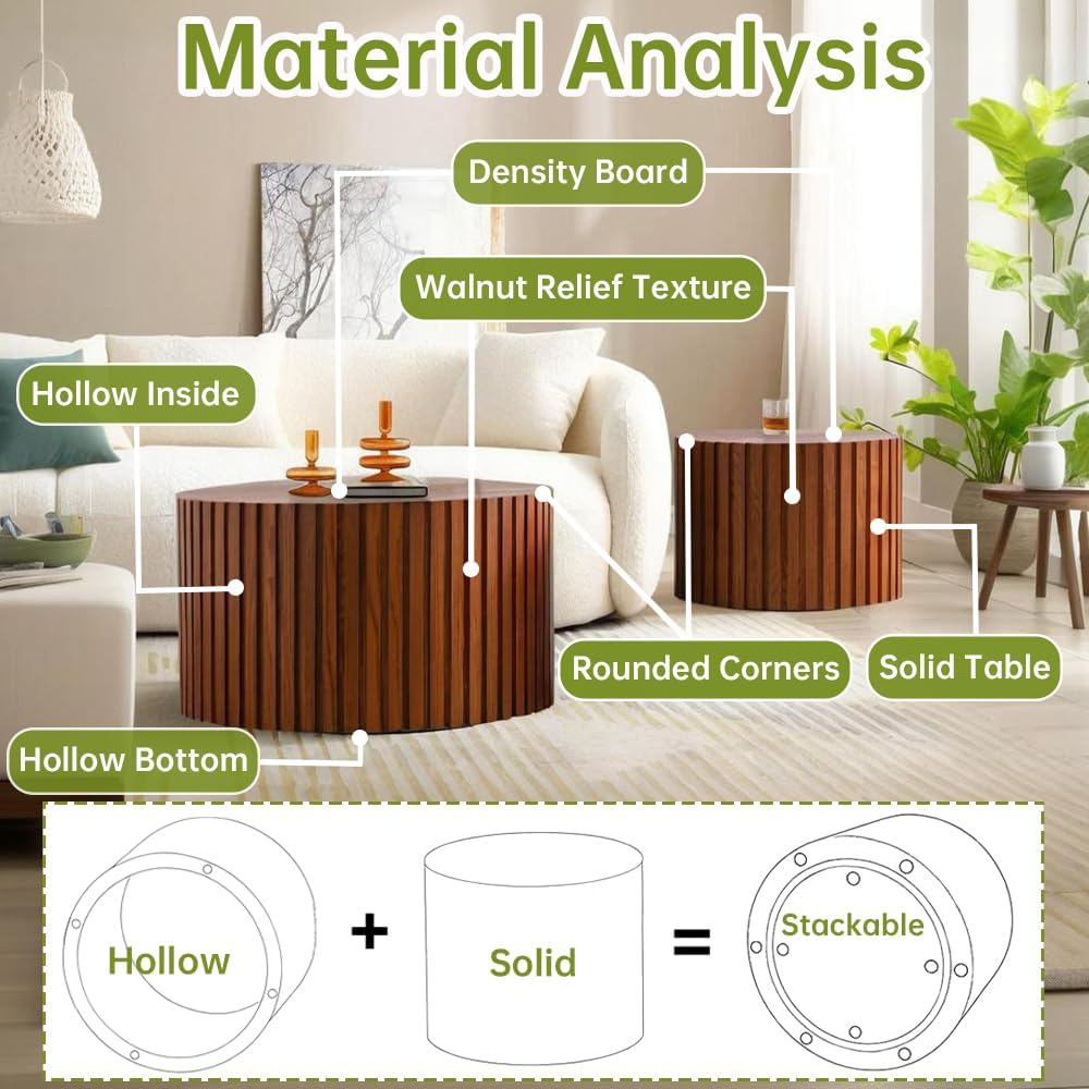 Round Nesting Coffee Table Modern Walnut Fluted Coffee Table Set of 2 Stripe Round Coffee Table Circle Drum Coffee Tables for Living Room (Walnut Large)