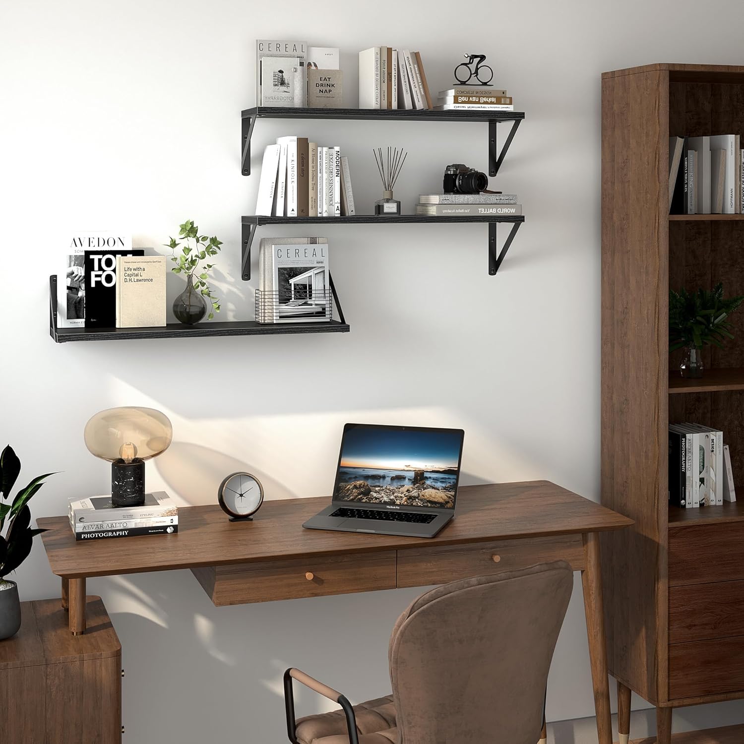 Heimlove Floating Shelves for Wall, 24 Inch Long Wood Floating Shelves Set of 3, Wall Mounted Hanging Shelf for Bathroom Bedroom Kitchen, Black