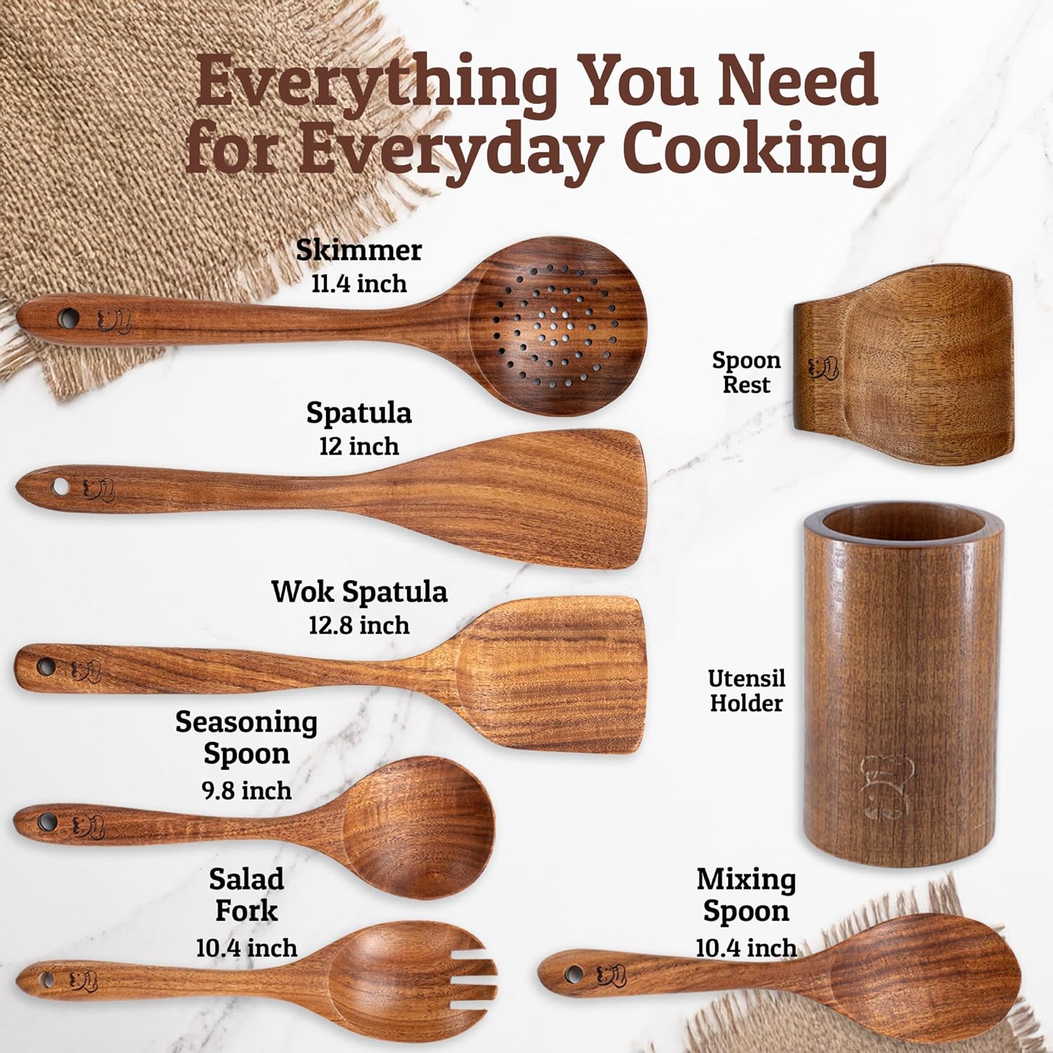 - Everything You Need - Set includes a flat spatula, wok spatula, mixing spoon, serving spoon, salad fork, and slotted skimmer - along with a matching teak utensil holder and spoon rest to keep your tools organized and your counters clean. Handcrafted from solid teak, each piece resists cracking and wear without needing constant maintenance. Just rinse, dry, and keep cooking—no coatings to peel, no seams to loosen.