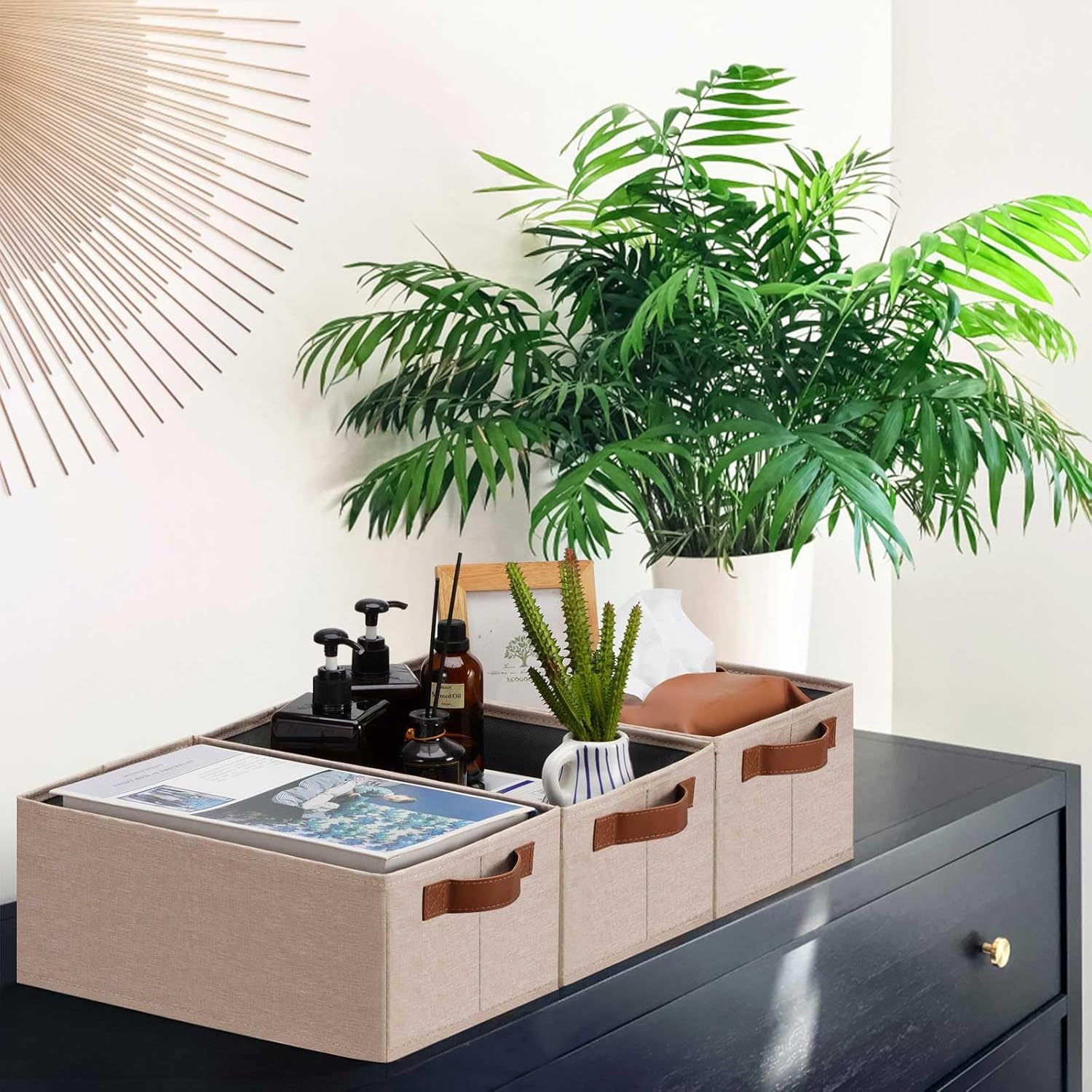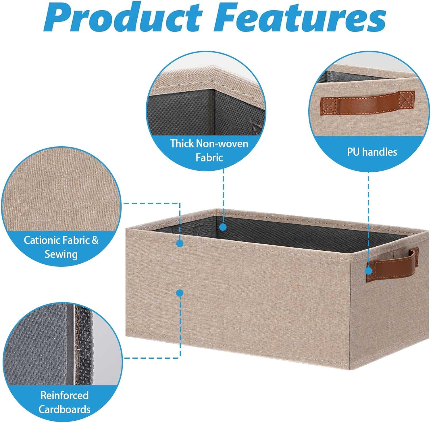 - 👍【QUALITY MATERIAL】Storage baskets for shelves are made of high-quality cationic fabric and polyester cotton fabric, and the inner layer is made of non-woven fabric, which is odorless, long-lasting and strong. Classic faux leather handles that adds a comfortable touch and provides a strong and comfort grip to pull and move. Fabric storage bin is easy to clean, just wipe with a damp sponge or cloth