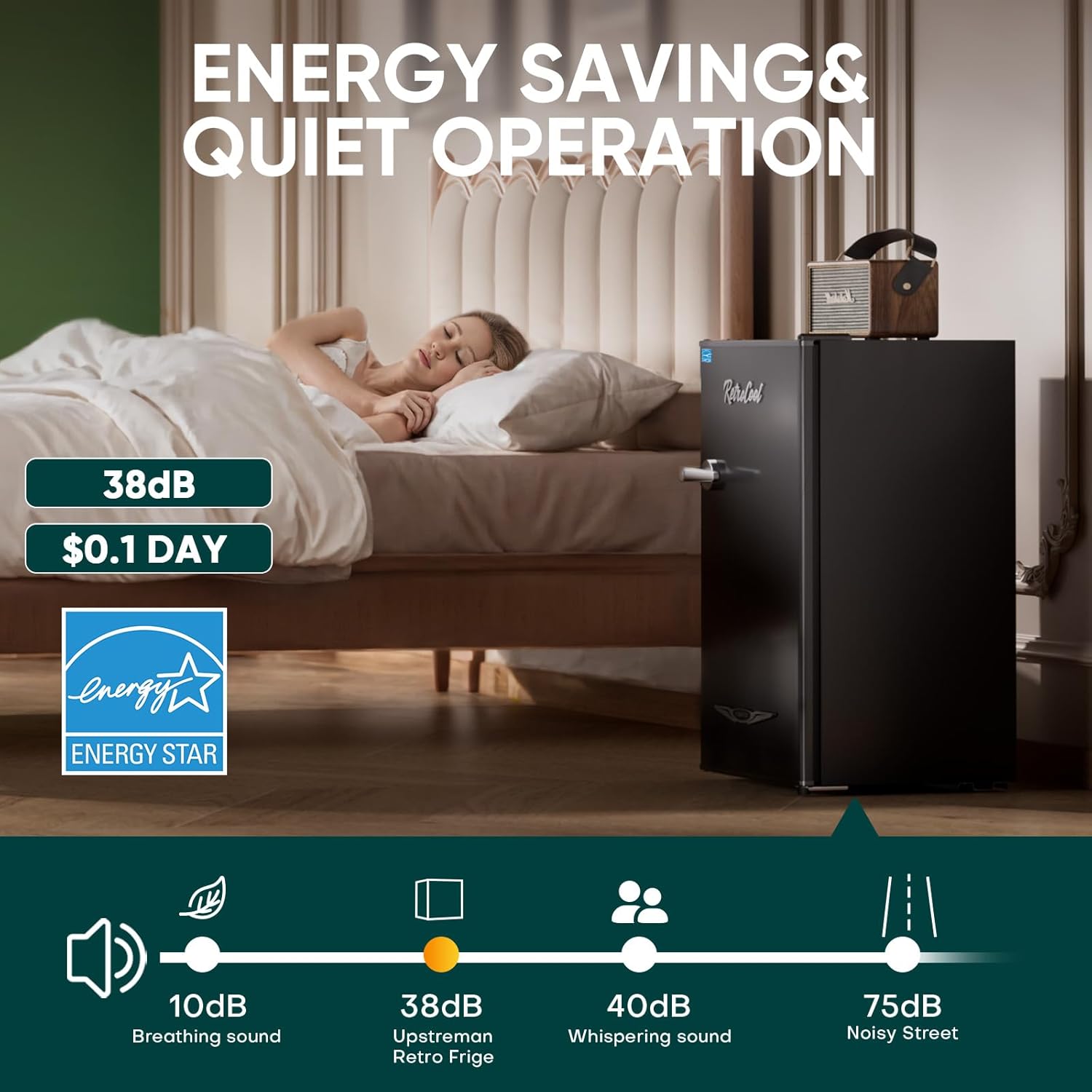 Upstreman 3.2 Cu.Ft Retro Mini Fridge with Bottle Opener, Energy Saving, Adjustable Thermostat, Metal Handle, LED Lamp, Mini Refrigerator for Bedroom, Office, Dorm-BR321 PRO (Black)