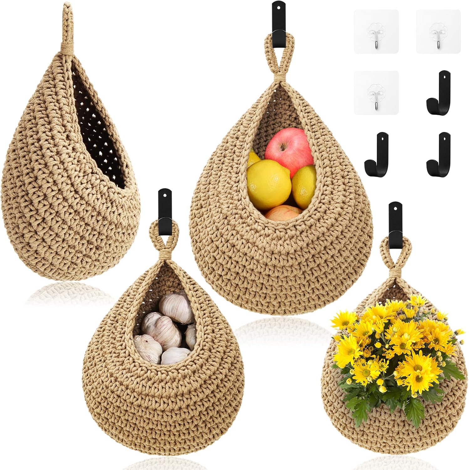 - 【Storage Basket Set】 - You will receive 3 different Boho wall baskets with 6 hanging hooks go together in a complete collection. Our hanging fruit basket wall decor offers a cohesive look when grouped together. Scattered around, these hanging wall basket create a customized arrangement. Save your home space, make your home more beautiful and your life more organized.