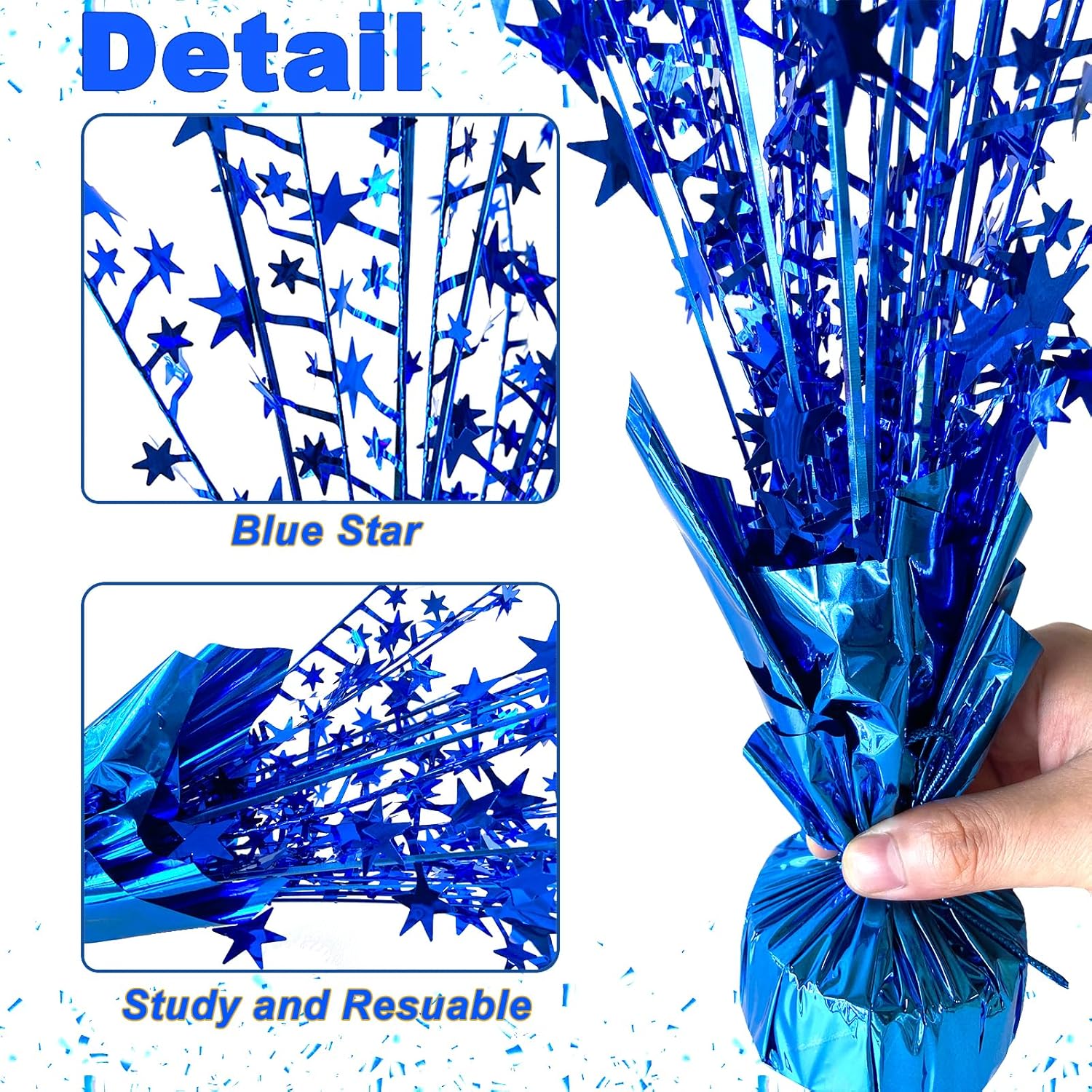 - Fine Workmanship: The glitter blue star centerpieces are made of quality metallic plastic, foil and metal wire,not easy to break or fade. The cement base is steady with wrapped in silver foil, not easy to fall down, blue table spray decorations can be recycle use year after year